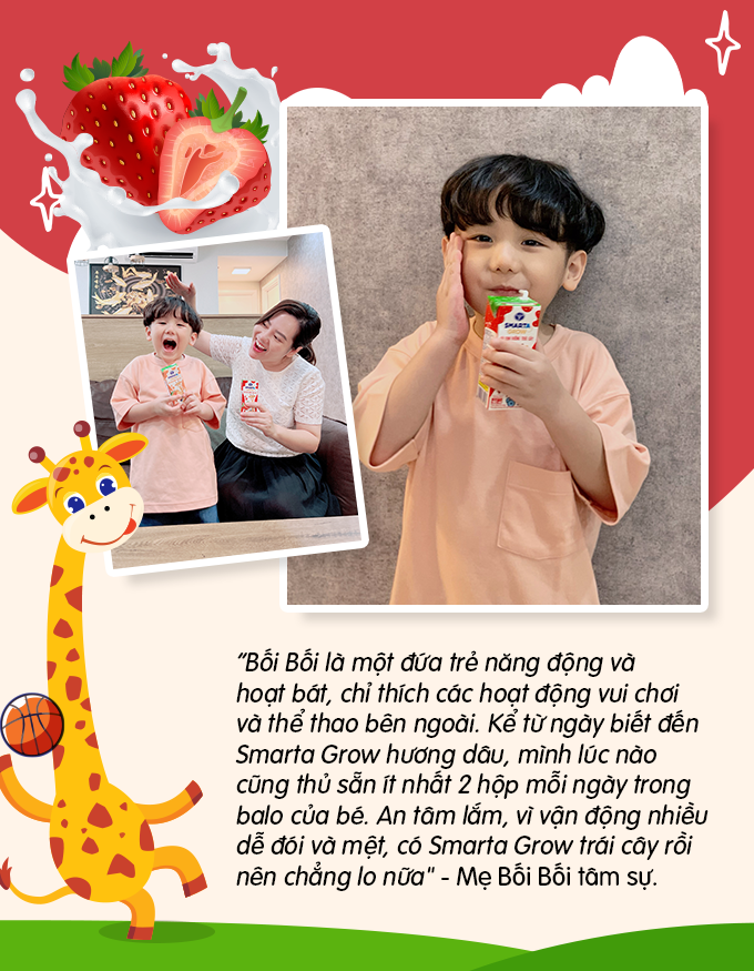 Với bộ đôi “dưỡng chất vàng” canxi và vitamin D3 có trong sữa dinh dưỡng trái cây Smarta Grow, bé được hỗ trợ phát triển cao hơn, khôn lớn hơn. Cùng với đó, hàm lượng vitamin B, B12 được chiết xuất từ quả dâu tây và cam tạo nên nguồn năng lượng dồi dào, kết hợp với tỉ lệ đạm – đường – chất béo phù hợp giúp bé khỏe mạnh, vui chơi, học tập mỗi ngày.