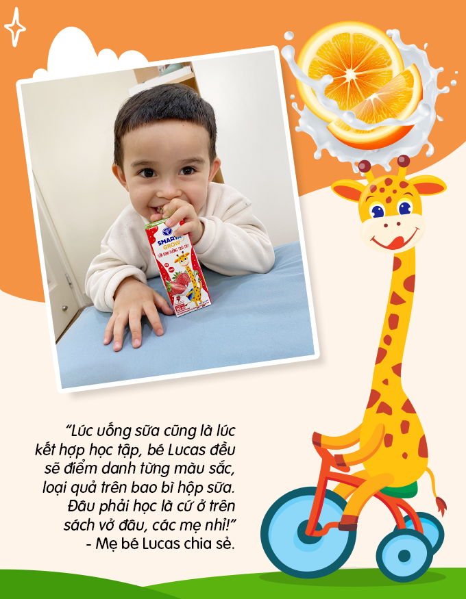Sữa dinh dưỡng Smarta Grow trái cây sở hữu bao bì đáng yêu với chú hươu cao cổ và màu sắc sinh động. Do đó, bé có thể học nhận diện màu sắc và tên các loại quả từ ngay chính bao bì hộp sữa.