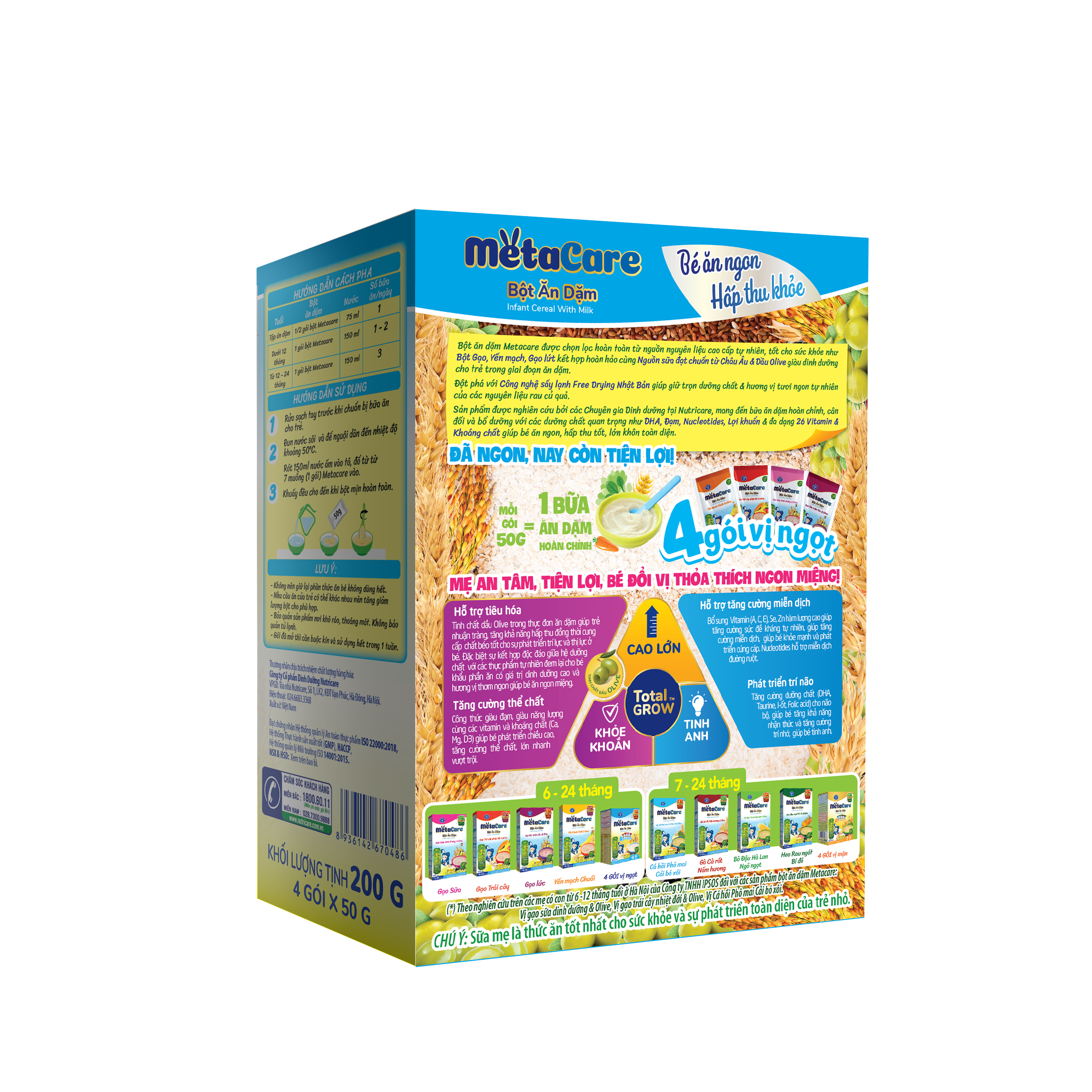 Bột ăn dặm Metacare được chọn lọc hoàn toàn từ nguồn nguyên liệu tự nhiên, đột phá với Công thức sấy đông lạnh – Freeze Drying Nhật Bản giúp giữ trọn dưỡng chất và hương vị ngon tự nhiên, bổ sung DHA, Lợi khuẩn, Tinh chất dầu Olive ưu việt giúp bé ăn ngon hơn & hấp thu tốt.