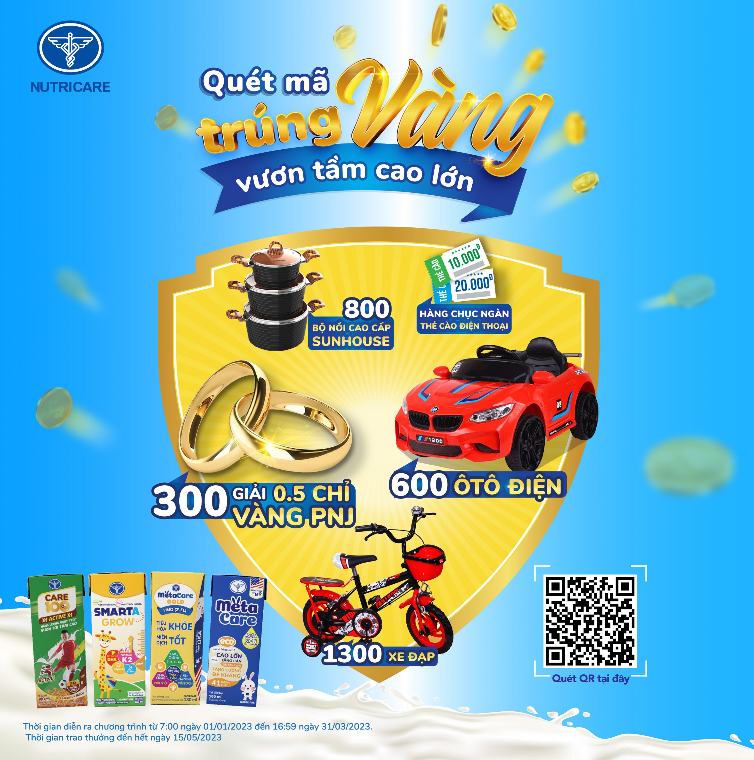 Công ty Cổ phần Dinh dưỡng Nutricare xin thông báo: Từ ngày 01.07.2022 cho đến ngày 30.09.2022, Quý khách hàng sẽ có cơ hội nhận ngay vàng PNJ cùng hàng ngàn phần quà giá trị khác khi mua các sản phẩm sữa nước của ColosCare, Smarta, MetaCare và tham gia chương trình khuyến mại “Quét mã trúng vàng – Vươn tầm cao lớn”