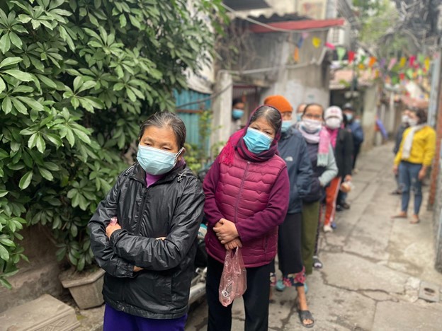 Người dân xóm chạy thận xếp hàng nhận sữa dinh dưỡng được hỗ trợ bởi công ty Nutricare trong đợt trao sữa cuối cùng năm 2021