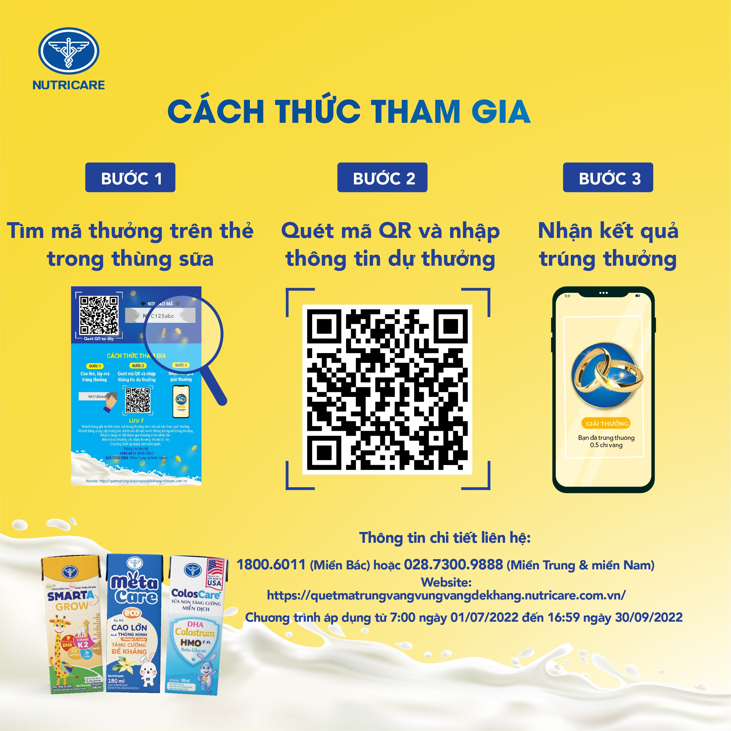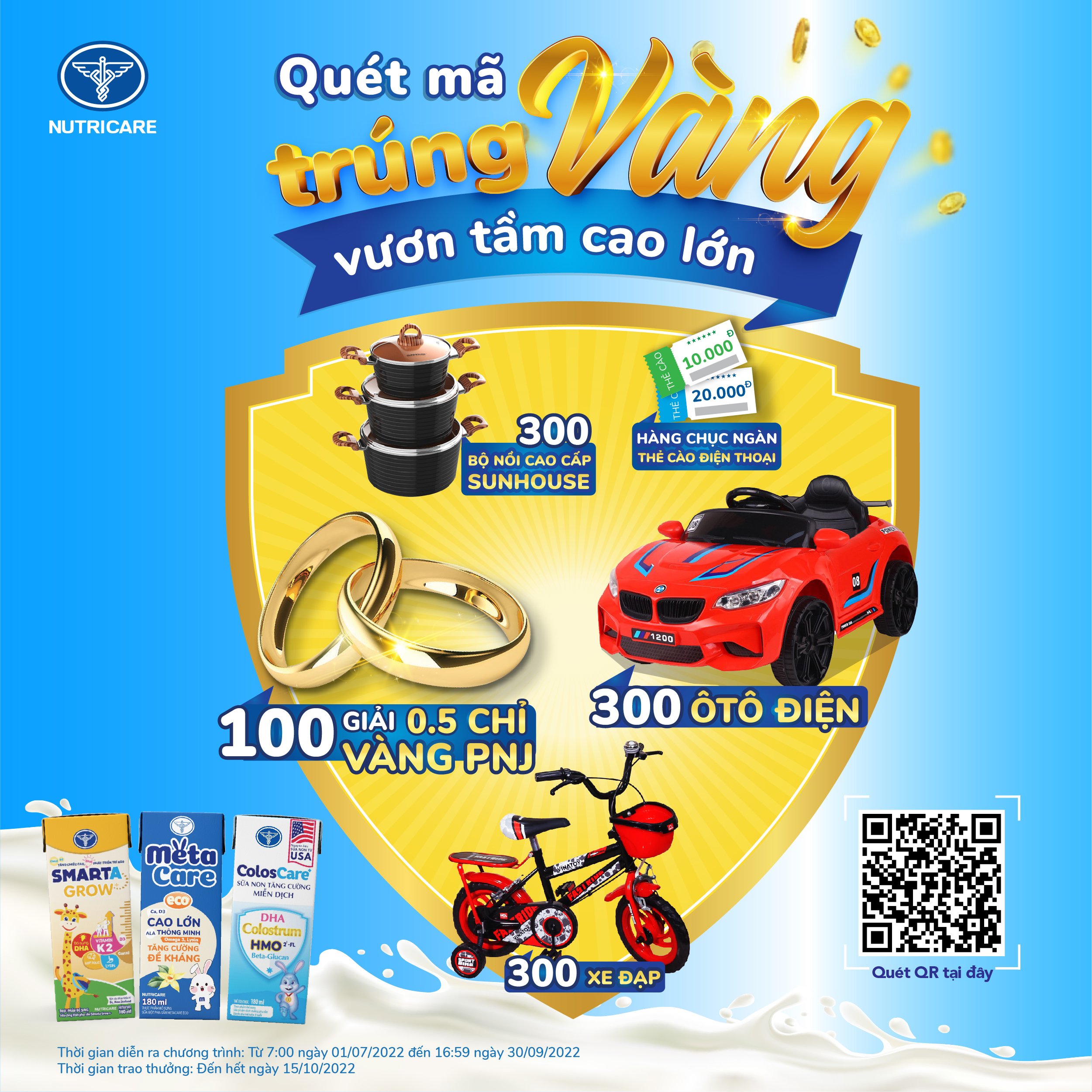 Trong thời gian diễn ra chương trình, từ ngày 1/7/2022 – 30/9/2022, khách hàng khi mua các sản phẩm sữa pha sẵn ColosCare+, Smarta Grow+ và Metacare Eco sẽ có cơ hội nhận được hàng chục nghìn giải thưởng hấp dẫn, bao gồm: 100 giải đặc biệt: Mỗi giải 0,5 chỉ vàng 9999 PNJ; 300 giải nhất: Mỗi giải 1 xe ô tô điện đồ chơi trẻ em; 300 giải nhì: Mỗi giải 1 bộ nồi cao cấp; 300 giải ba: Mỗi giải 1 xe đạp thể thao trẻ em, cùng hàng chục nghìn thẻ cào điện thoại với mệnh giá 10.000 đồng và 20.000 đồng.
