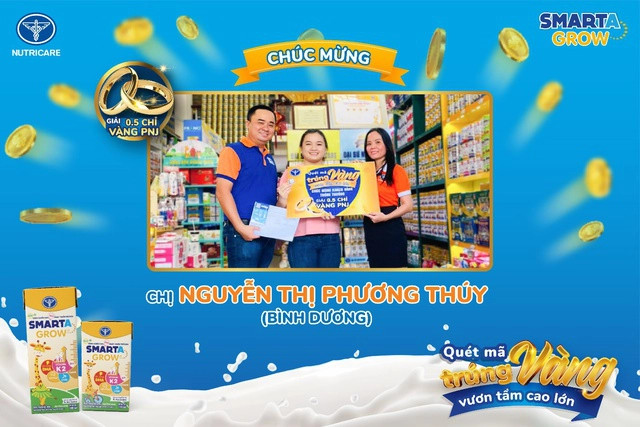 Thường xuyên tin dùng sản phẩm sữa pha sẵn Smarta Grow+ của nhãn hàng Smarta Grow, nhưng chị Nguyễn Thị Phương Thúy (Bình Dương) vẫn cảm thấy như “trong mơ” khi biết tin mình trúng 0,5 chỉ vàng 9999 PNJ từ chương trình “Quét mã trúng vàng – Vươn tầm cao lớn”.