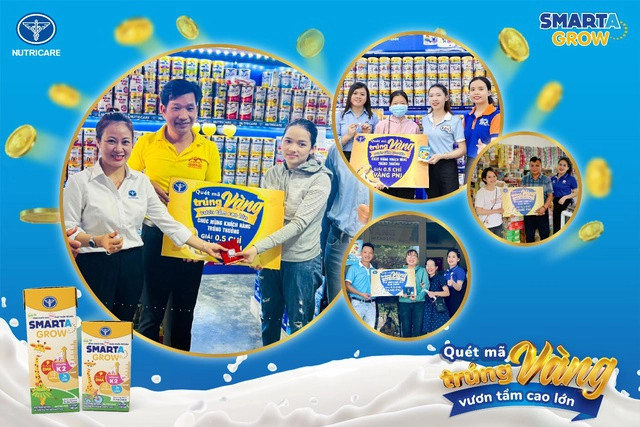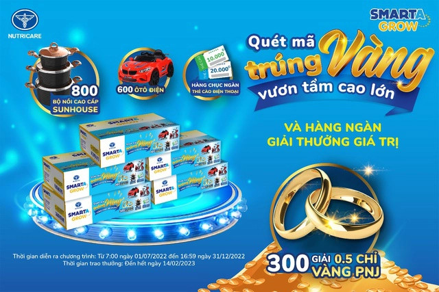 Chương trình “Quét mã trúng vàng – Vươn tầm cao lớn” dành cho sản phẩm sữa bột pha sẵn Smarta Grow+ của Nutricare chính thức được khởi động từ 1/7/2022. Sau hơn 2 tháng triển khai, chương trình đã dần tìm thấy chủ nhân của nhiều phần quà giá trị, đặc biệt là những khách hàng may mắn trúng giải Đặc biệt 0,5 chỉ vàng 9999 PNJ.
