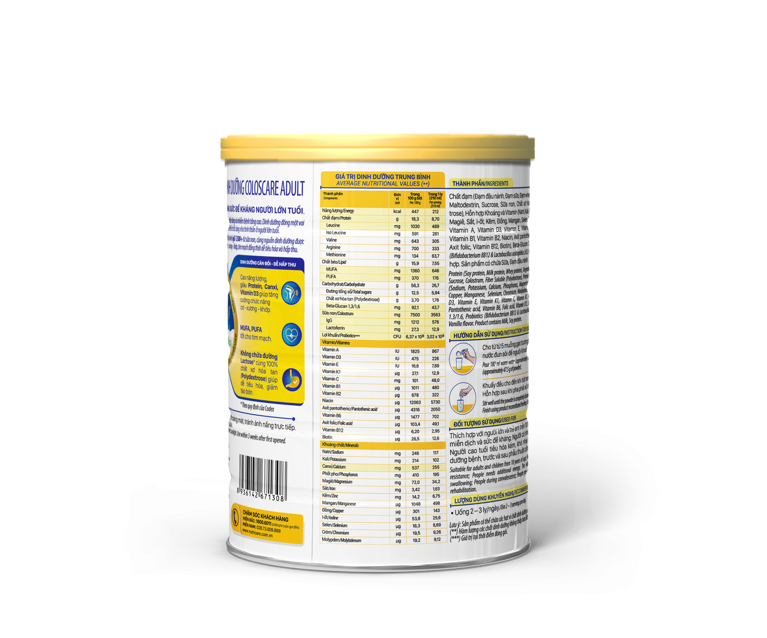 ColosCare Adult – DINH DƯỠNG TĂNG SỨC ĐỀ KHÁNG NGƯỜI LỚN TUỔI. Càng lớn tuổi, sức đề kháng càng suy giảm, nguy cơ gặp phải các tình trạng rối loạn chức năng và nhiễm bệnh tăng cao. Dinh dưỡng đóng một vai trò đặc biệt quan trọng trong việc hỗ trợ tăng sức đề kháng, giúp cải thiện sức khỏe về thể chất cũng như tinh thần ở người lớn tuổi. ColosCare Adult - Sản phẩm dinh dưỡng đột phá với hàm lượng cao kháng thể tự nhiên IgG 1212 mg từ sữa non, cùng nguồn dinh dưỡng được thiết kế phù hợp với người lớn tuổi cần tăng sức đề kháng, tăng cường sức khỏe cơ - xương - khớp, tim mạch đồng thời hỗ trợ dễ tiêu hóa và hấp thu.