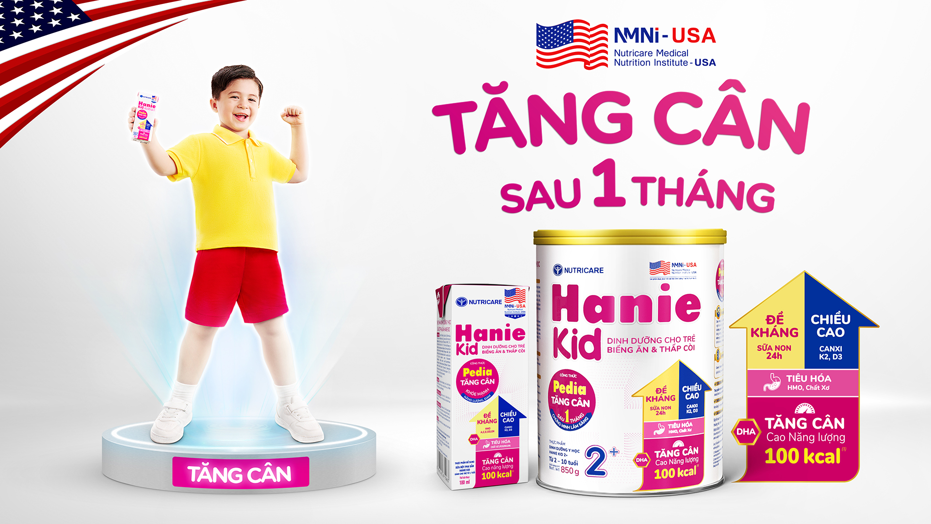 Không chỉ quan tâm đến trẻ có đề kháng kém, Nutricare và NMNI-USA còn tập trung phát triển công thức dinh dưỡng cho trẻ suy dinh dưỡng, biếng ăn. Đây là đối tượng có thể trạng gầy, yếu và thường biếng ăn. Thiếu hụt dinh dưỡng kéo dài cũng làm đề kháng yếu đi khiến trẻ dễ ốm bệnh, chậm phát triển thể chất và trí tuệ. Hanie Kid 2+ mới được phát triển thành công bởi NMNI-USA với công thức Pedia và cao năng lượng 100 kcal theo khuyến nghị của WHO – công thức đã được đưa vào phác đồ điều trị chuẩn dành cho trẻ bị suy dinh dưỡng, nhẹ cân, thấp còi giúp trẻ tăng cân sau 1 tháng đã được chứng minh lâm sàng.