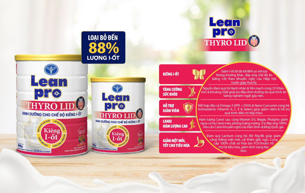 Leanpro Thyro LID loại bỏ tới 88% hàm lượng i-ốt, hạn chế lượng i-ốt nạp vào cơ thể. Đồng thời, sữa còn giúp bổ sung đầy đủ vi chất dinh dưỡng khác cho chế độ ăn kiêng mà không sợ bị thiếu dinh dưỡng.