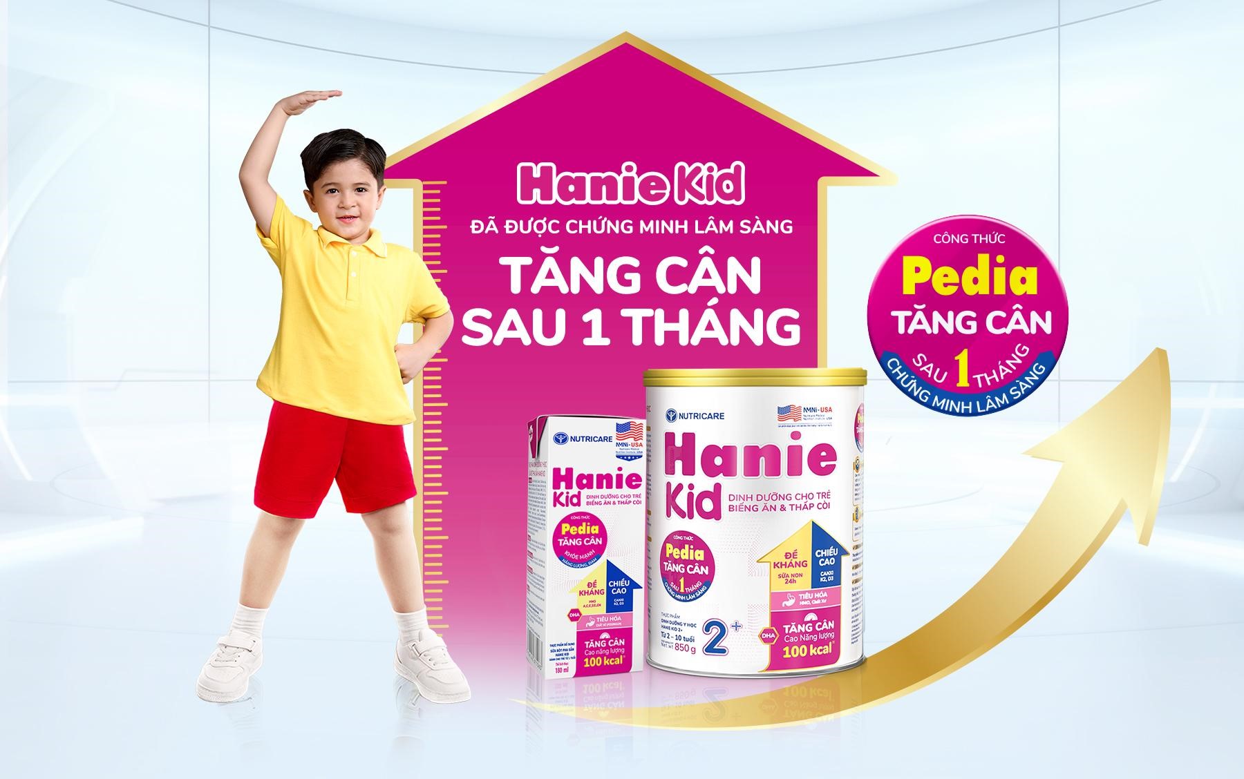 Hanie Kid 2+ mới dành riêng cho trẻ biếng ăn, suy dinh dưỡng, thấp còi, đã được chứng minh lâm sàng giúp trẻ tăng cân sau 1 tháng