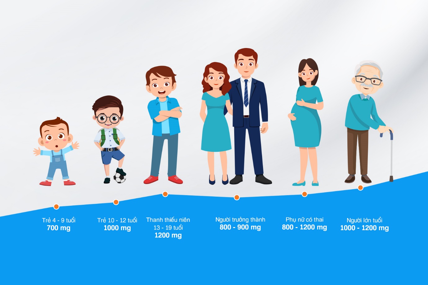 However, calcium needs in each age group are not the same. According to the Vietnam Association of Functional Foods, infants need 300-400mg of Calcium per day, children from 1-3 years old need 600mg, children from 4-9 years old need 700mg, children from 10-12 years old need 1000mg, teenagers from 13-19 years old need 1200mg.