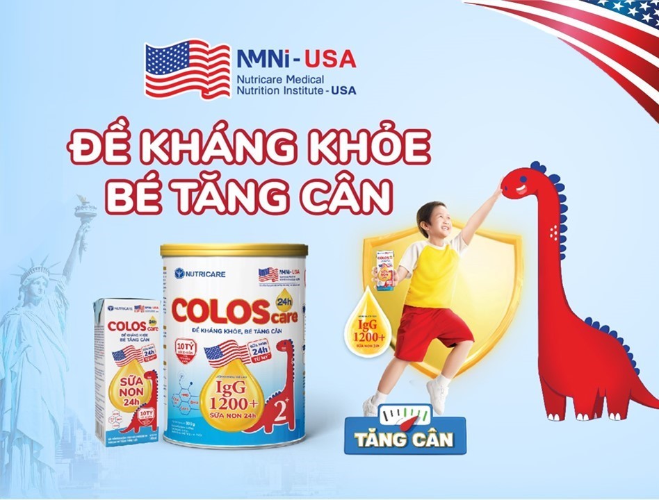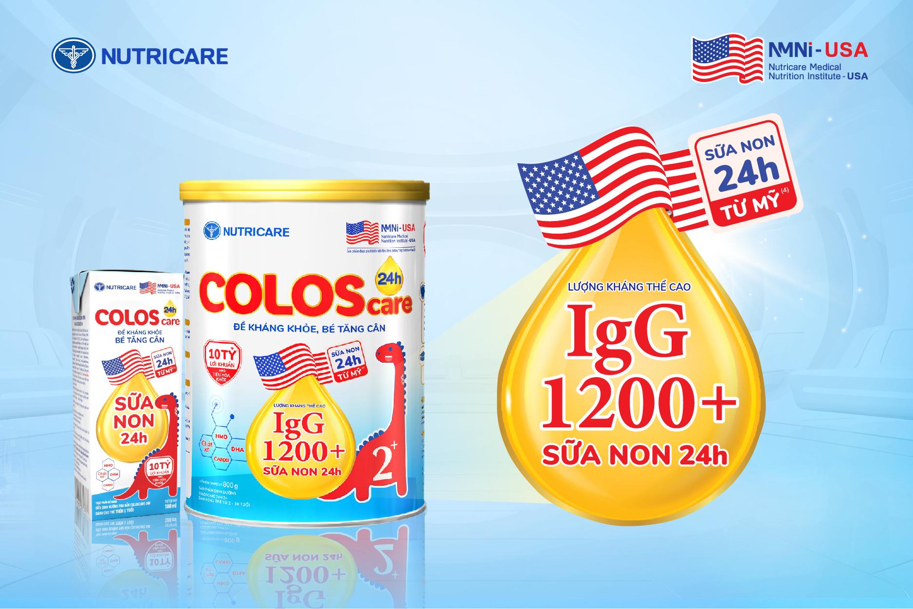 Currently, Colostrum 24h has become a popular choice thanks to its outstanding benefits for young children. With the goal of providing optimal nutrition, the Nutricare Medical Nutrition Institute – USA (NMNI-USA) and Nutricare have carefully selected Colostrum 24h with an exceptionally high IgG antibody content of 1200 mg and imported directly from the US. Colostrum 24h has been added to the product ColosCare 24h 2+ with an IgG antibody content of 1200 mg, playing an important role in supporting a healthy immune system in children.