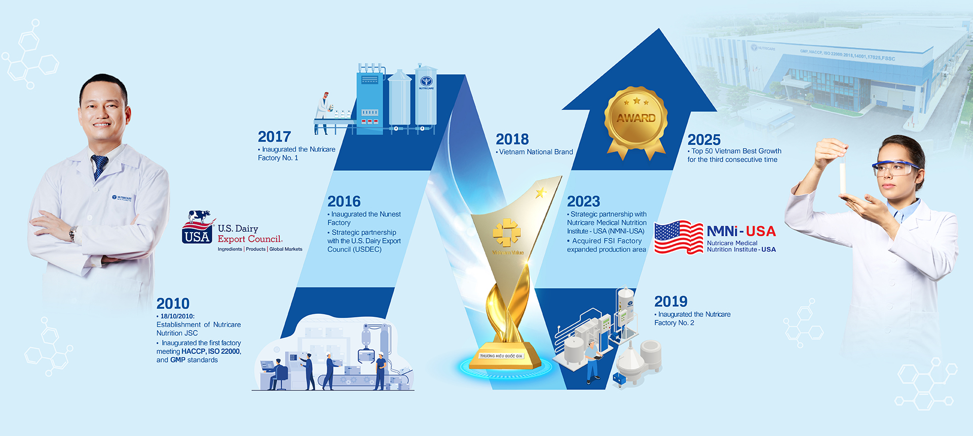In 2010, Nutricare's journey of "Pioneering the creation of a Medical Nutrition ecosystem" began. Throughout this steadfast journey, Nutricare has steadfastly maintained its mission of pioneering in researching and applying the world's leading Medical Nutrition solutions, especially US standards, to care for and improve the quality of life for millions of Vietnamese families.