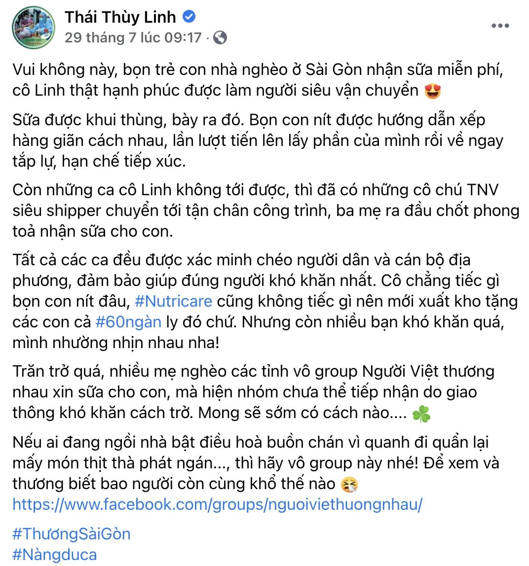 “Vui không này, cô Linh thật hạnh phúc được làm người siêu vận chuyển. Sữa được khui thùng, bày ra đó. Bọn con nít được hướng dẫn xếp hàng giãn cách nhau, lần lượt tiến lên lấy phần của mình rồi về ngay tắp lự, hạn chế tiếp xúc. Còn những ca cô Linh không tới được, thì đã có những cô chú tình nguyện viên siêu shipper chuyển tới tận chân công trình, ba mẹ ra đầu chốt phong toả nhận sữa cho con. Tất cả các ca đều được xác minh chéo người dân và cán bộ địa phương, đảm bảo giúp đúng người khó khăn nhất.” – Thái Thùy Linh viết trên trang cá nhân.