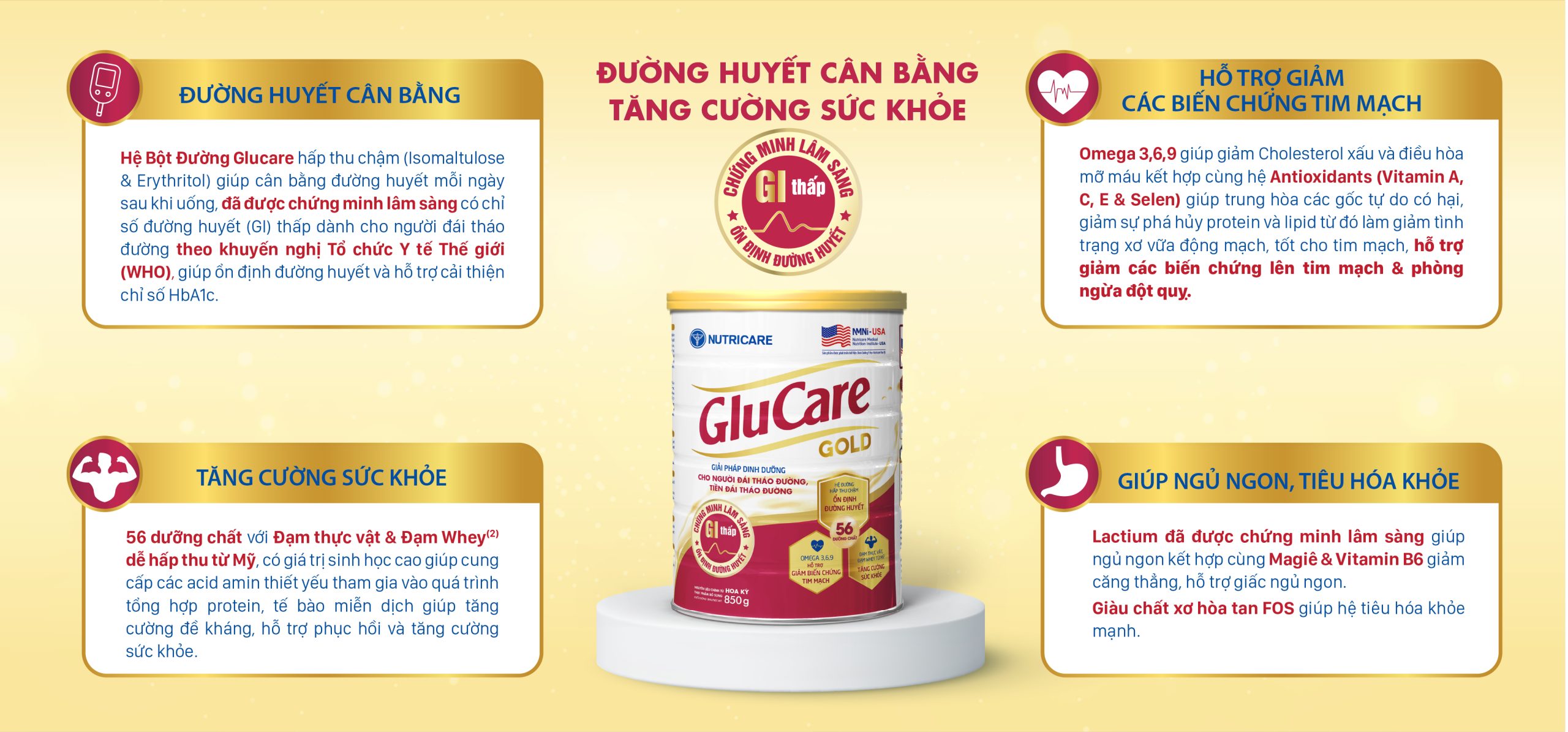 Hệ Bột Đường Glucare hấp thu chậm (Isomaltulose & Erythritol) giúp cân bằng đường huyết mỗi ngày sau khi uống, đã được minh lâm chứng sàng có chỉ số đường huyết (GI) thấp dành cho người đái tháo đường theo khuyến nghị Tổ chức Y tế Thế giới (WHO), giúp ổn định đường huyết và hỗ trợ cải thiện chỉ số HbA1c.