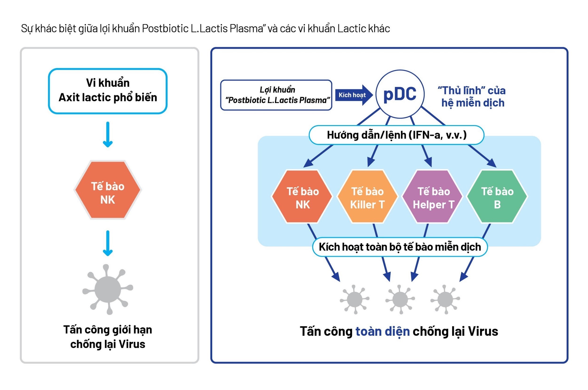 Hầu hết các vi khuẩn Axit Lactic hỗ trợ miễn dịch một phần bằng cách tác động lên một loại tế bào miễn dịch. Chủ yếu là tế bào tiêu diệt tự nhiên (NK) đóng vai trò trong phản ứng miễn dịch bẩm sinh, nên khả năng tấn công chống lại vi-rút còn hạn chế. Trong khi đó, lợi khuẩn Postbiotic L.Lactis Plasma có khả năng kích hoạt trực tiếp tế bào “thủ lĩnh” hệ miễn dịch pDC – có vai trò quan trọng trong việc nhận diện và phản ứng nhanh chóng với các tác nhân gây bệnh, sản xuất interferon-alpha (IFN-α) để tiêu diệt vi-rút và kích hoạt các tế bào miễn dịch khác như tế bào NK và tế bào T hỗ trợ. Nhờ vào những đặc điểm vượt trội này, lợi khuẩn Postbiotic L.Lactis Plasma đóng vai trò quan trọng trong việc làm giảm nguy cơ mắc bệnh do virus, điều hòa phản ứng miễn dịch và tăng cường sức khỏe toàn diện.