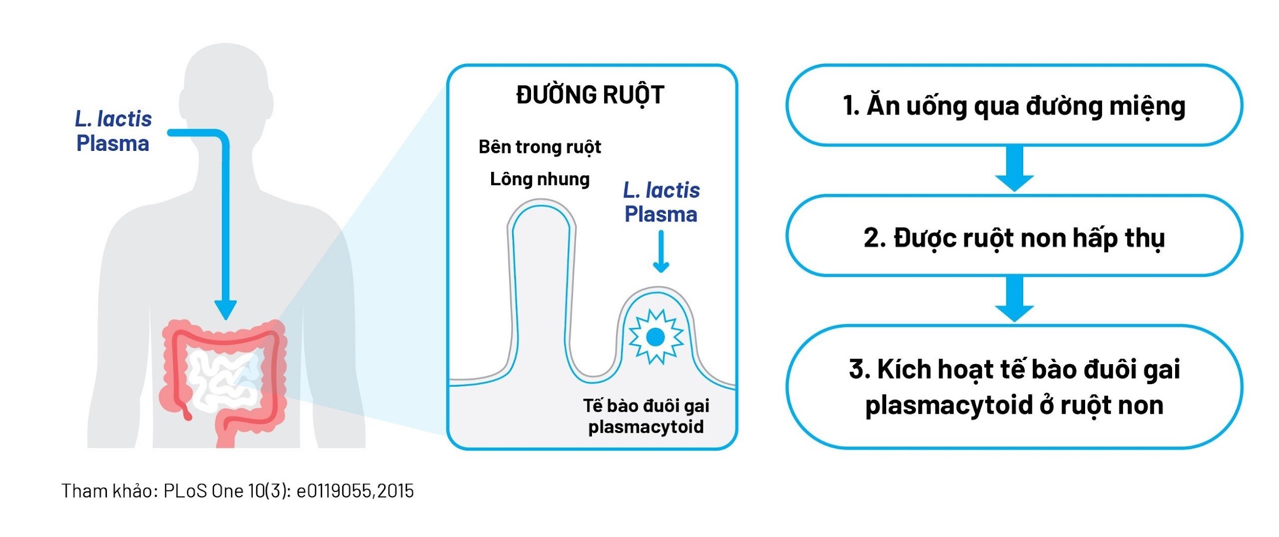 Bên trong ruột non có những vùng đặc biệt, được gọi là mảng Peyer, nơi tập trung phần lớn các tế bào miễn dịch (bao gồm cả thủ lĩnh hệ miễn dịch pDC). Khi lợi khuẩn Postbiotic L.Lactis Plasma qua đường tiêu hóa đến ruột non sẽ kích hoạt trực tiếp tế bào pDC từ đó kích hoạt dây truyền toàn bộ tế bào miễn dịch giúp tăng cường khả năng phòng chống virus từ trong ra ngoài.