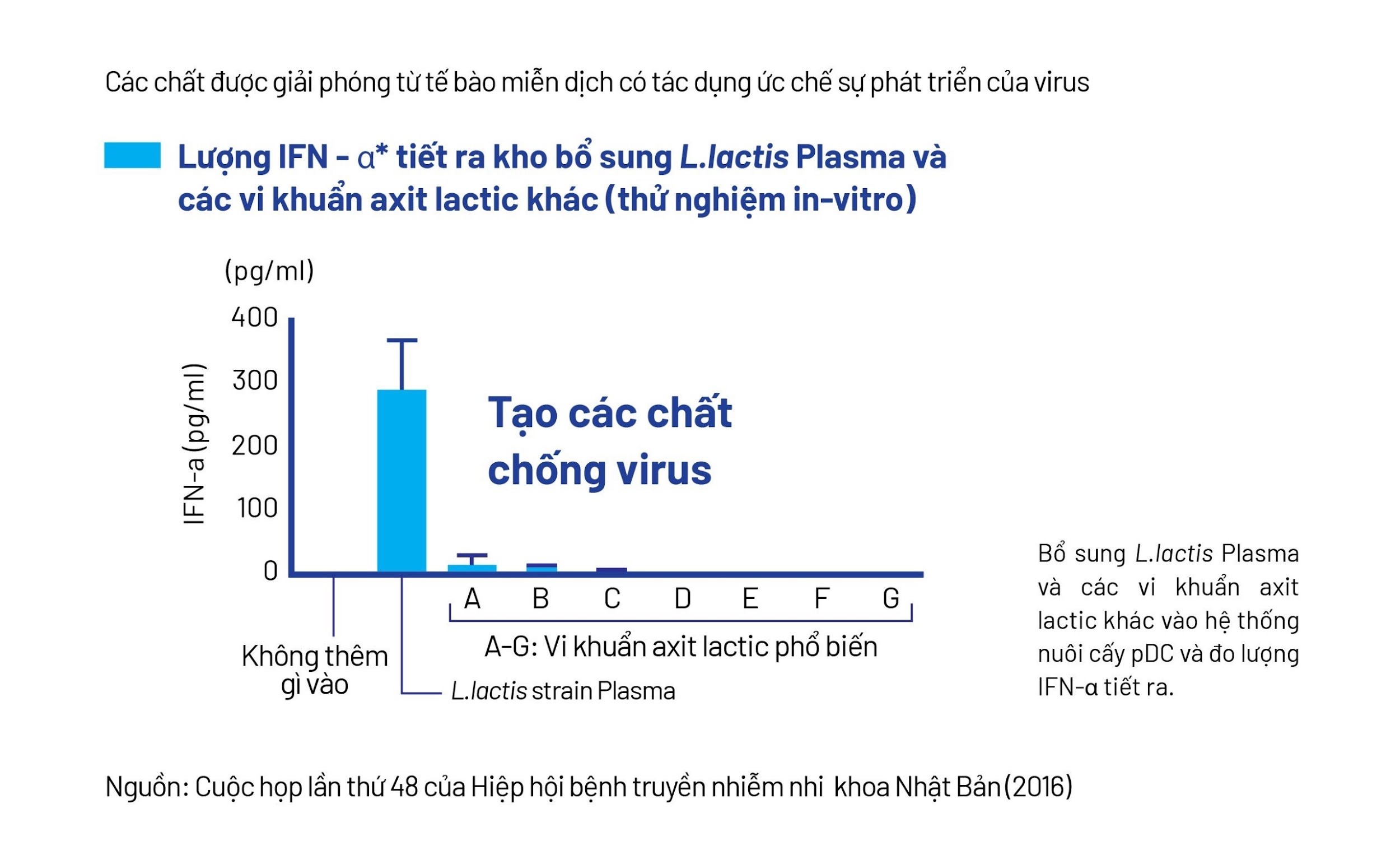 Trong một thử nghiệm in-vitro so sánh khả năng kích hoạt “thủ lĩnh” hệ miễn dịch pDC của lợi khuẩn Postbiotic L.Lactis Plasma và vi khuẩn Axit Lactic thông thường, các nhà khoa học nhận thấy lợi khuẩn Postbiotic L.Lactis Plasma có thể khiến “thủ lĩnh” hệ miễn dịch pDC tiết ra lượng IFN-α cao nhất, tăng cường khả năng chống vi-rút hiệu quả hơn so với vi khuẩn axit lactic thông thường.