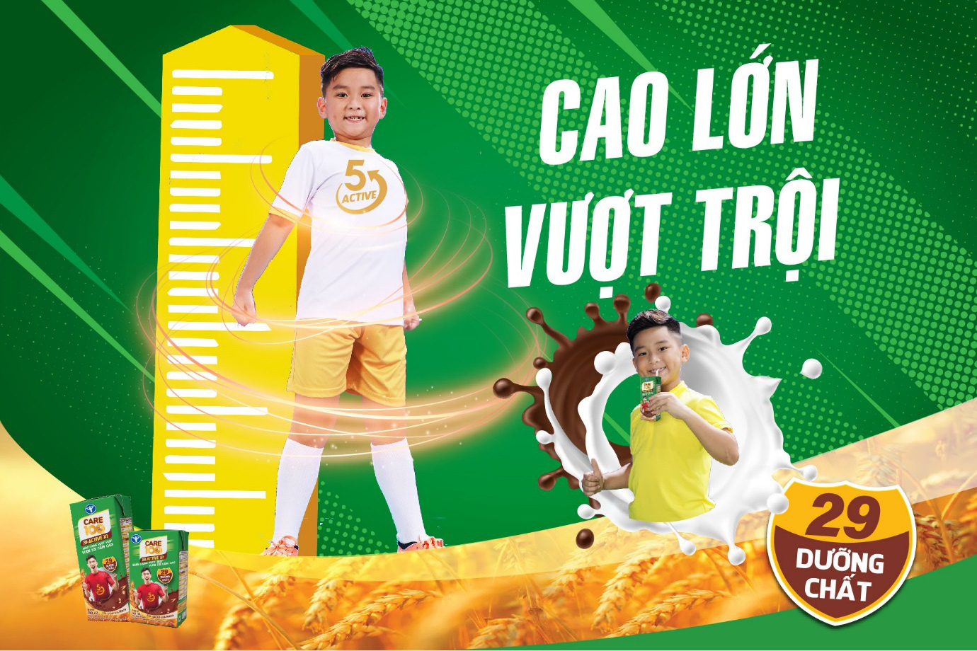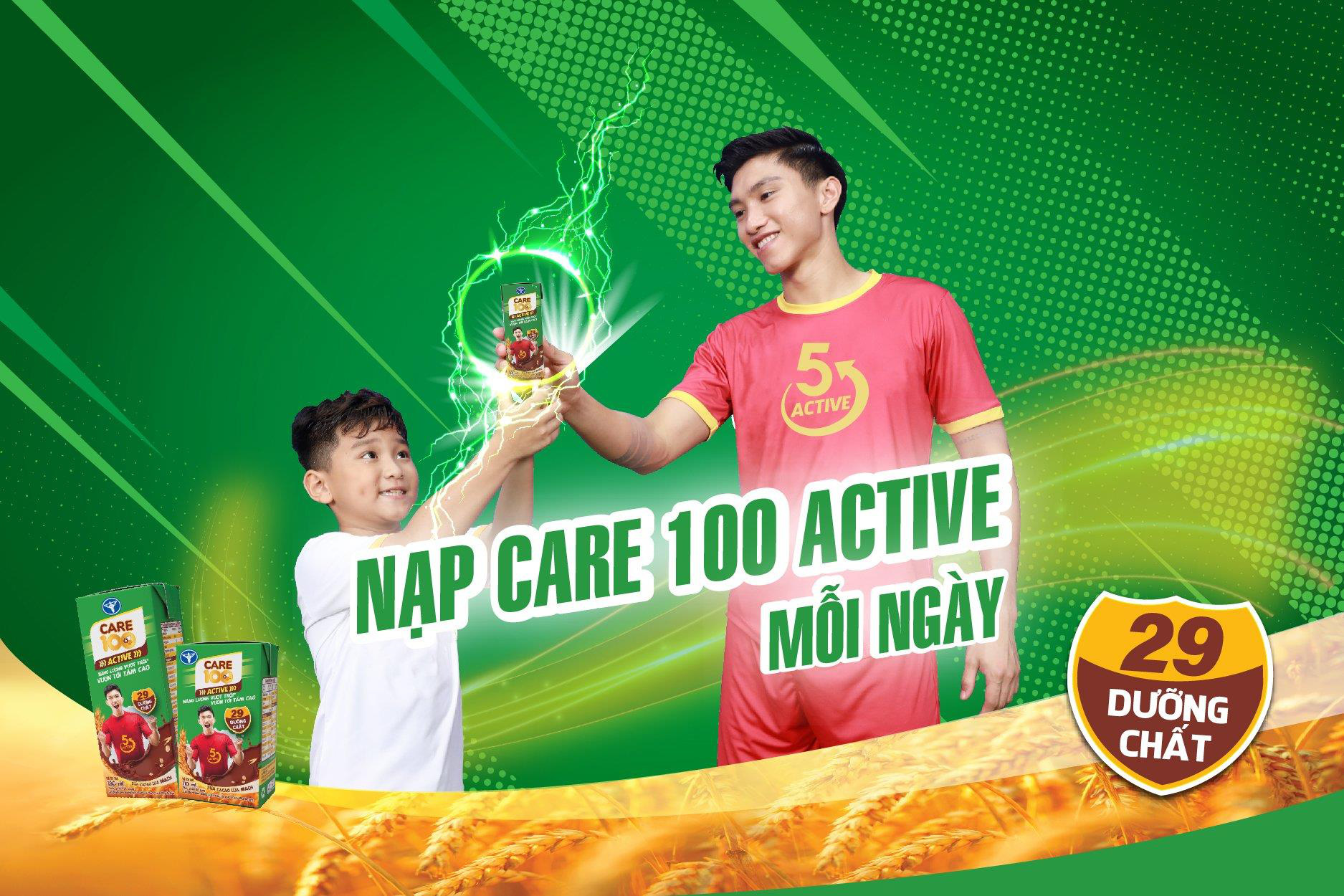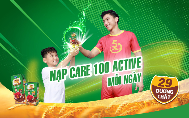 Mỗi ngày, đừng quên tập luyện khoa học, nghỉ ngơi hợp lý, ăn uống lành mạnh và bổ sung 2 – 3 hộp 180ml hoặc 3 – 4 hộp 110ml Care 100 Active vị cacao lúa mạch ngon tuyệt để vừa nhanh chóng bù đắp năng lượng tiêu hao trong vận động, học tập vừa thoát khỏi kiếp “nấm lùn”, vươn tới tầm cao như thần tượng Văn Hậu nhé!