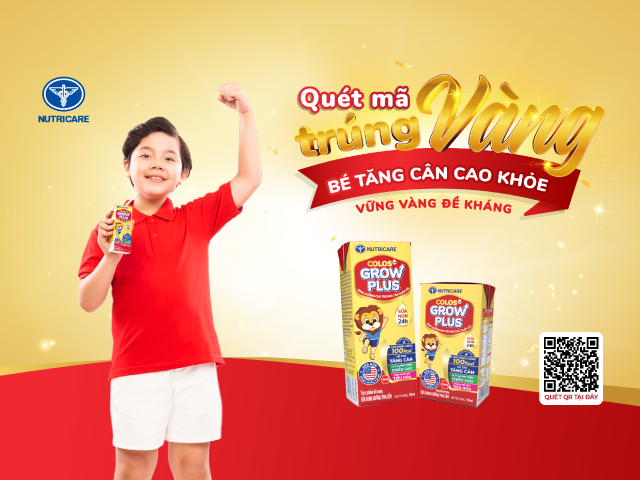 Nhằm tri ân tới người tiêu dùng đã tin tưởng và lựa chọn sản phẩm, Nutricare đã triển khai chương trình khuyến mại “Quét mã trúng vàng – Bé tăng cân cao khỏe”. Quý khách hàng khi mua sản phẩm sữa pha sẵn Nutricare Colos24h Grow Plus thùng 110ml và 180ml sẽ nhận một thẻ cào 100% trúng ngay một trong nhiều giải thưởng hấp dẫn như Vàng PNJ, xe máy Honda SH Mode, Honda Vision…