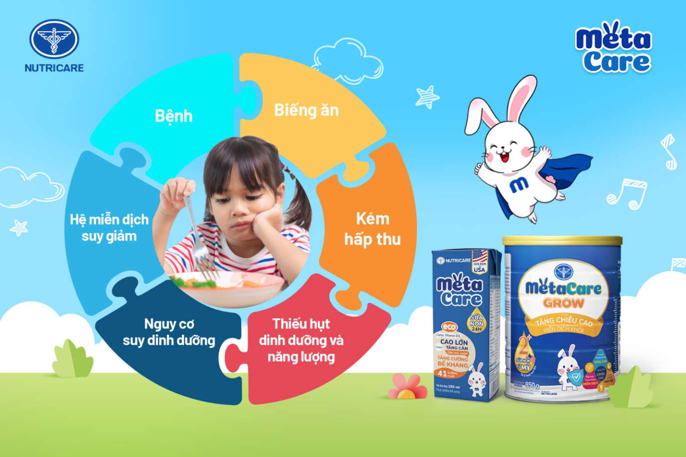 Đóng vai trò “người bạn dinh dưỡng” đồng hành cùng bé, bộ sản phẩm sữa dinh dưỡng Metacare là “lựa chọn vàng” cung cấp dưỡng chất toàn diện, xua tan nỗi lo về chiều cao, cân nặng hay khả năng miễn dịch, đề kháng ở trẻ. Nhờ vậy, mẹ cũng an tâm hơn về sức khỏe và sự phát triển của con trên chặng đường khôn lớn.