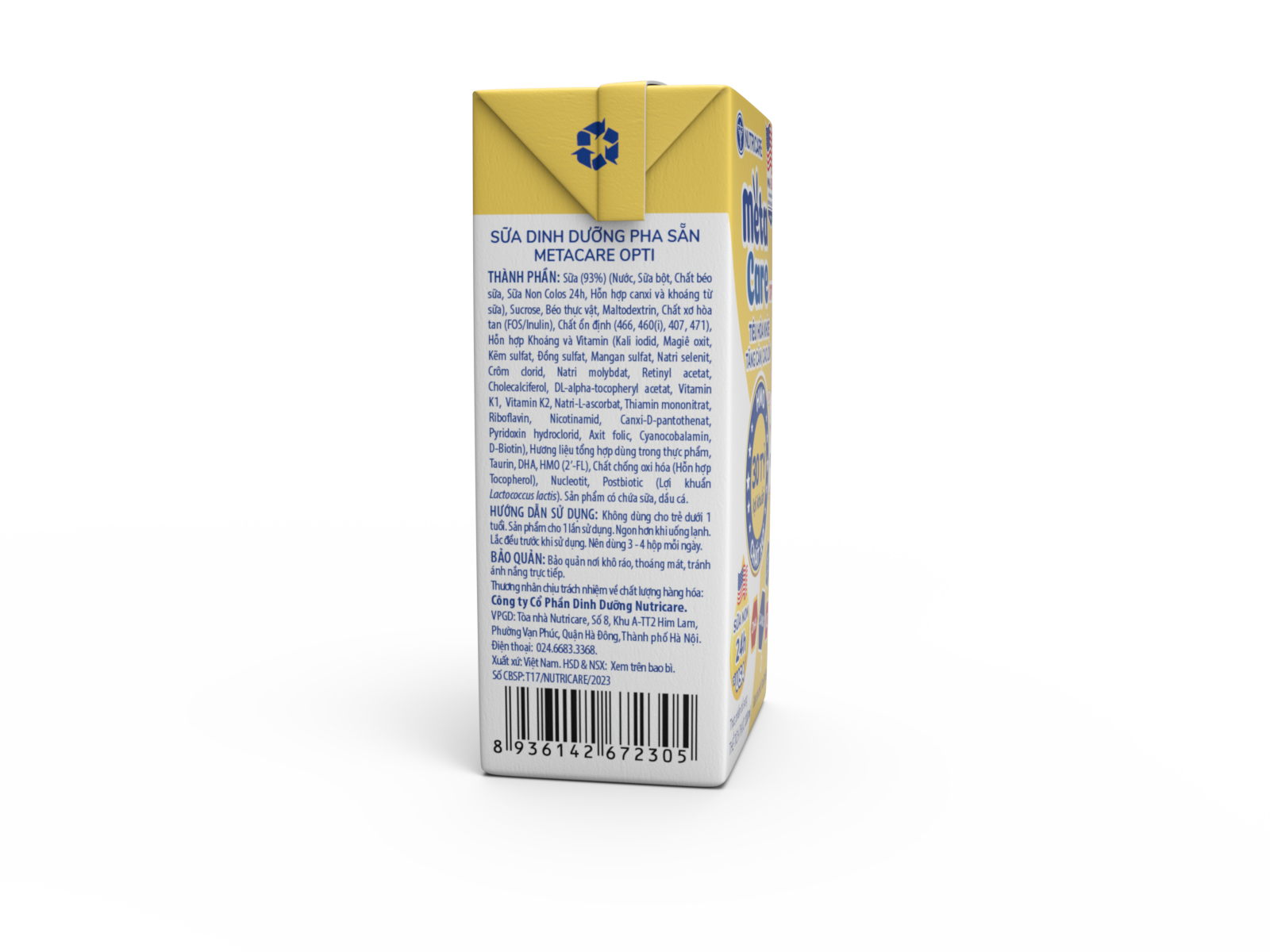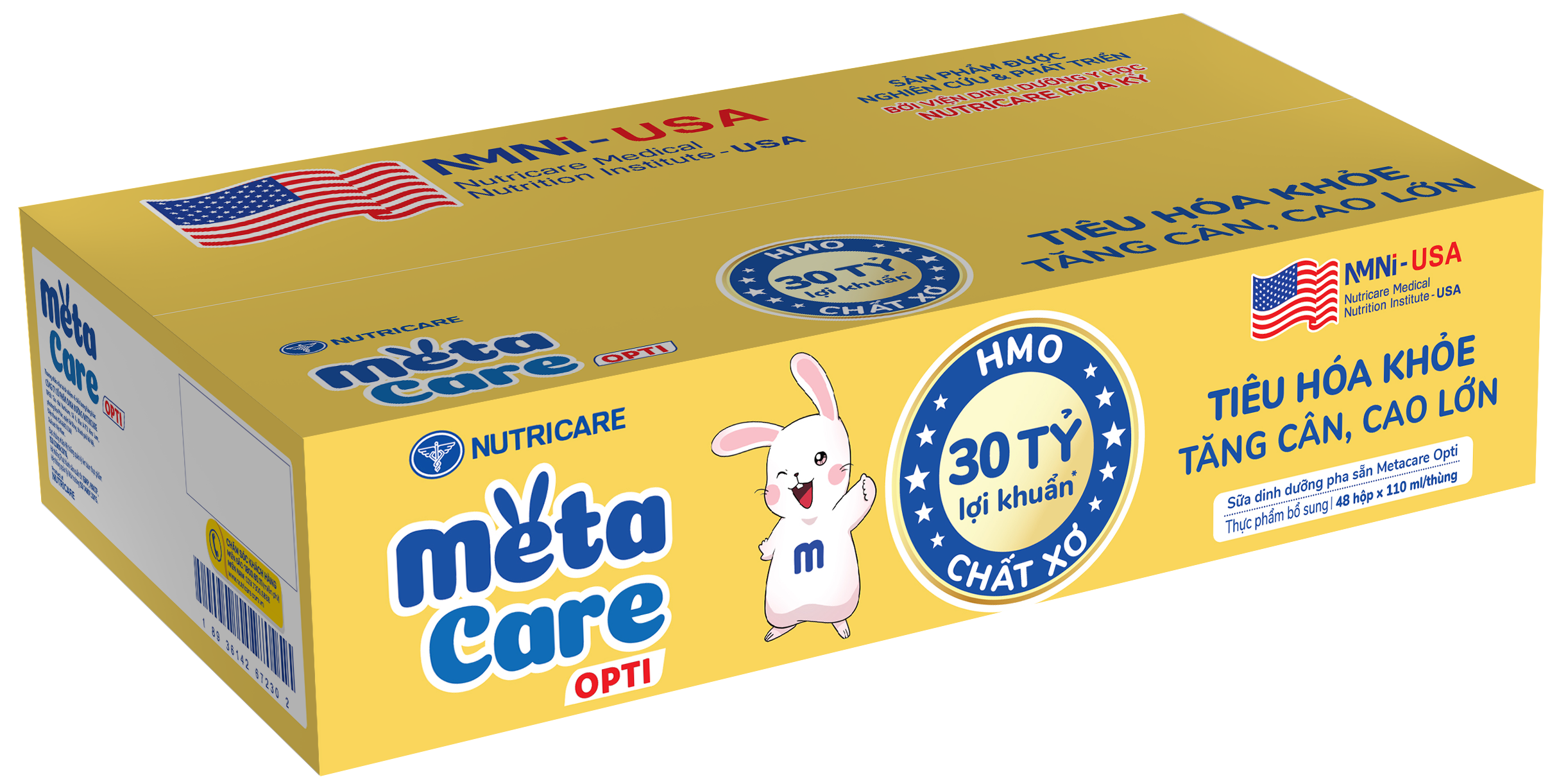 (*) Postbiotic (Lợi khuẩn Lactococcus Lactis, Lợi khuẩn Lactobacillus fermentum và Lactobacillus delbrueckii) tối thiểu trong 3 ly Metacare Opti 2+ pha chuẩn hoặc 3 hộp sữa dinh dưỡng pha sẵn Metacare Opti 180 ml.