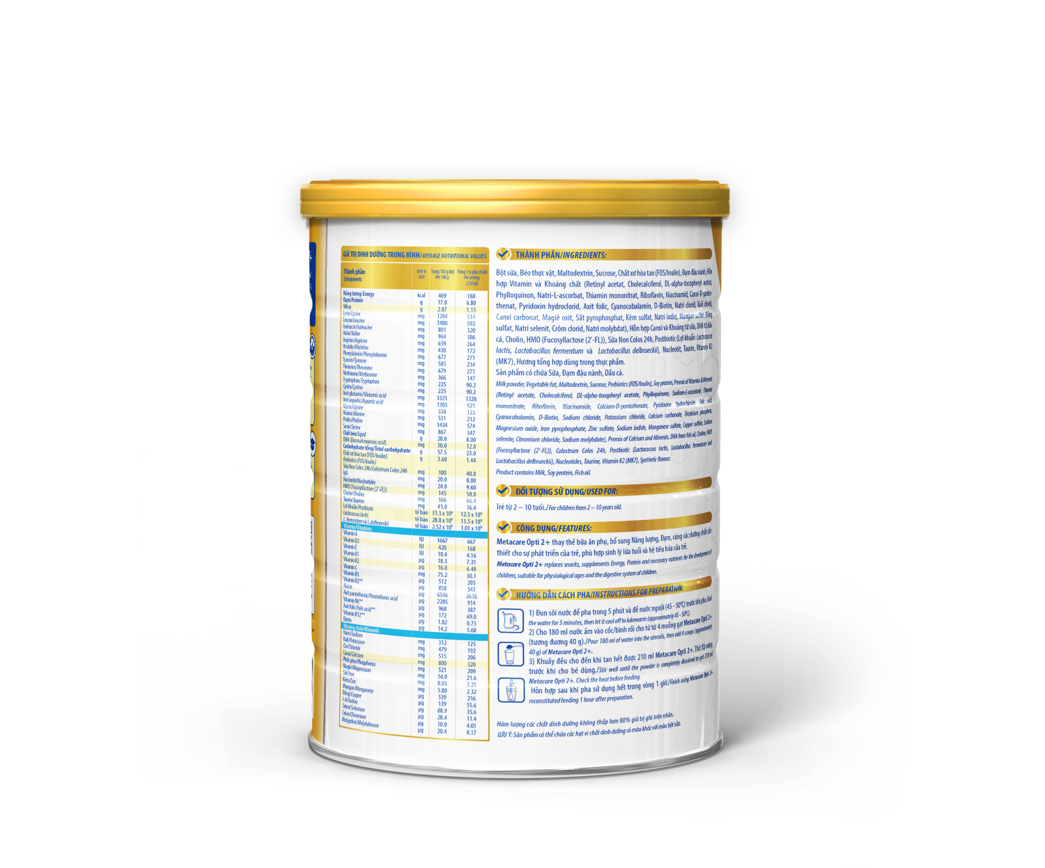 (*) Postbiotic (Lợi khuẩn Lactococcus Lactis, Lợi khuẩn Lactobacillus fermentum và Lactobacillus delbrueckii) tối thiểu trong 3 ly Metacare Opti 2+ pha chuẩn hoặc 3 hộp sữa dinh dưỡng pha sẵn Metacare Opti 180 ml.