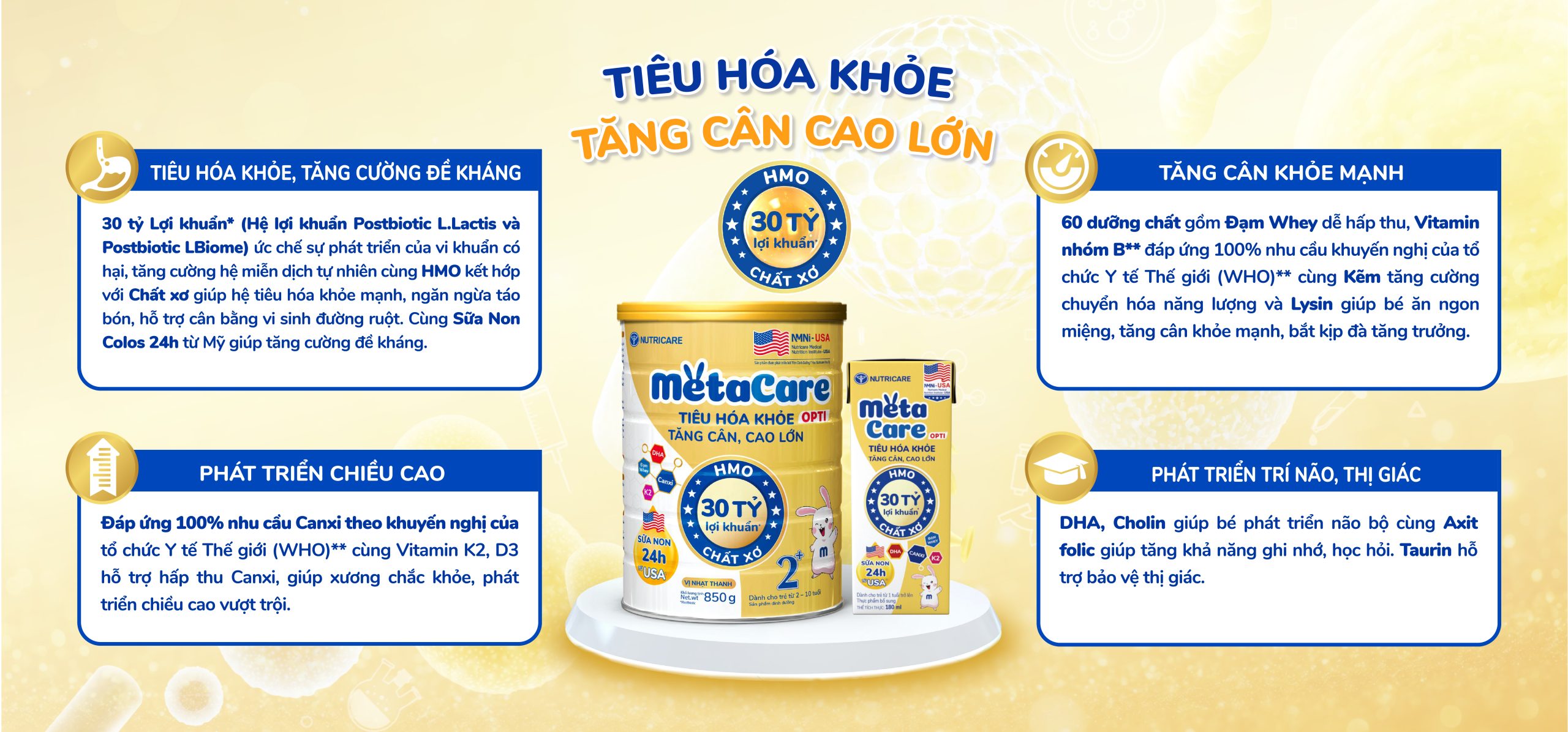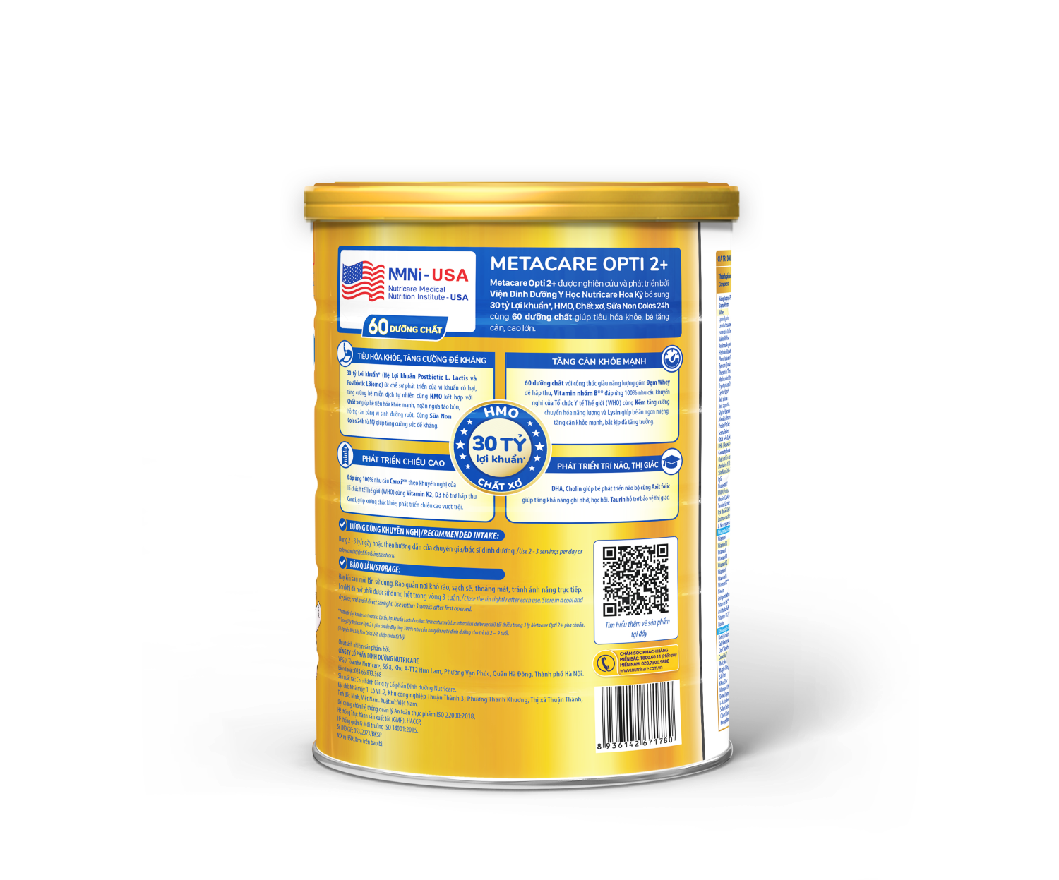 Metacare Opti được nghiên cứu và phát triển bởi Viện Dinh Dưỡng Y học Nutricare Hoa Kỳ bổ sung 30 tỷ Lợi khuẩn(*), HMO, Sữa non từ Mỹ cùng nhiều dưỡng chất giúp tiêu hóa khỏe, bé tăng cân cao lớn.