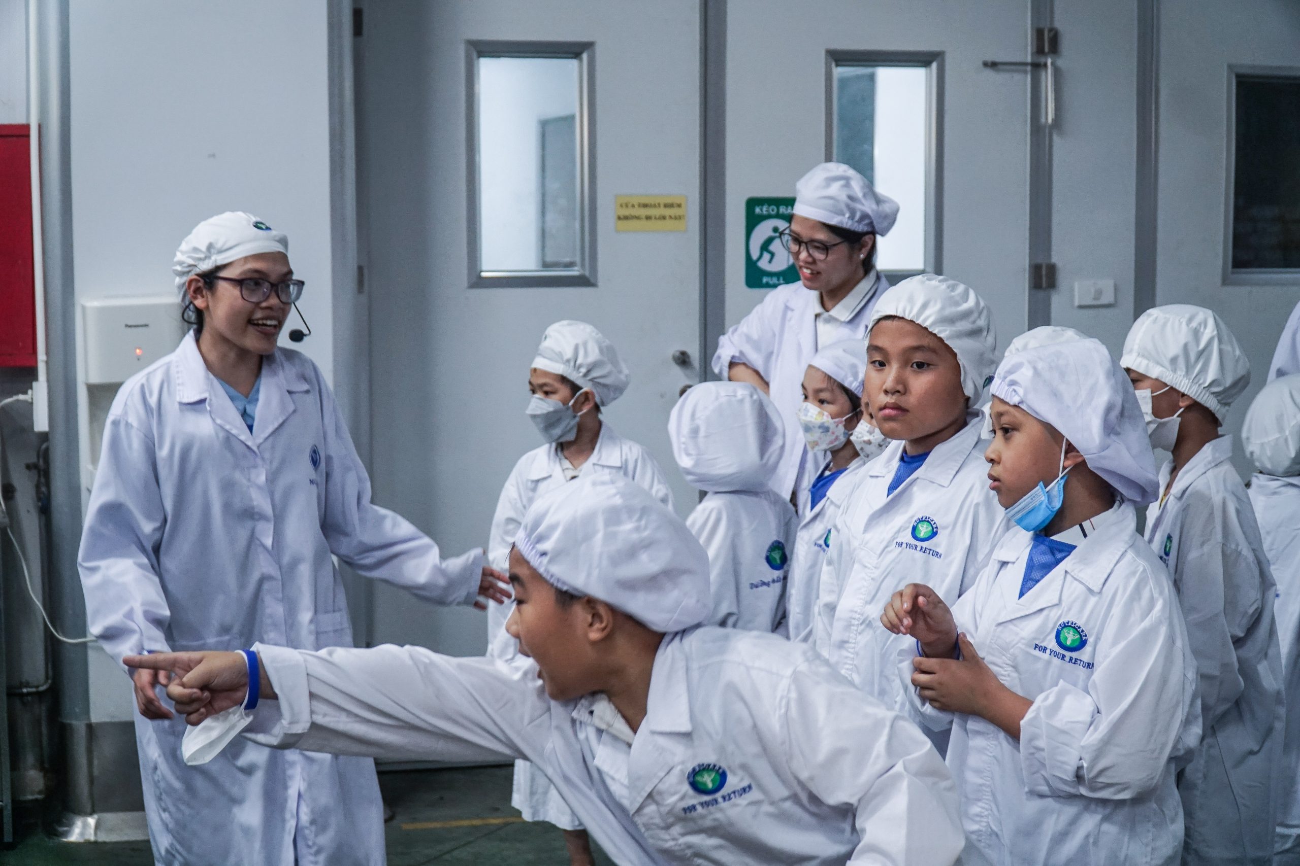 Các bé hào hứng khi nghe thuyết trình về các công đoạn sản xuất sữa