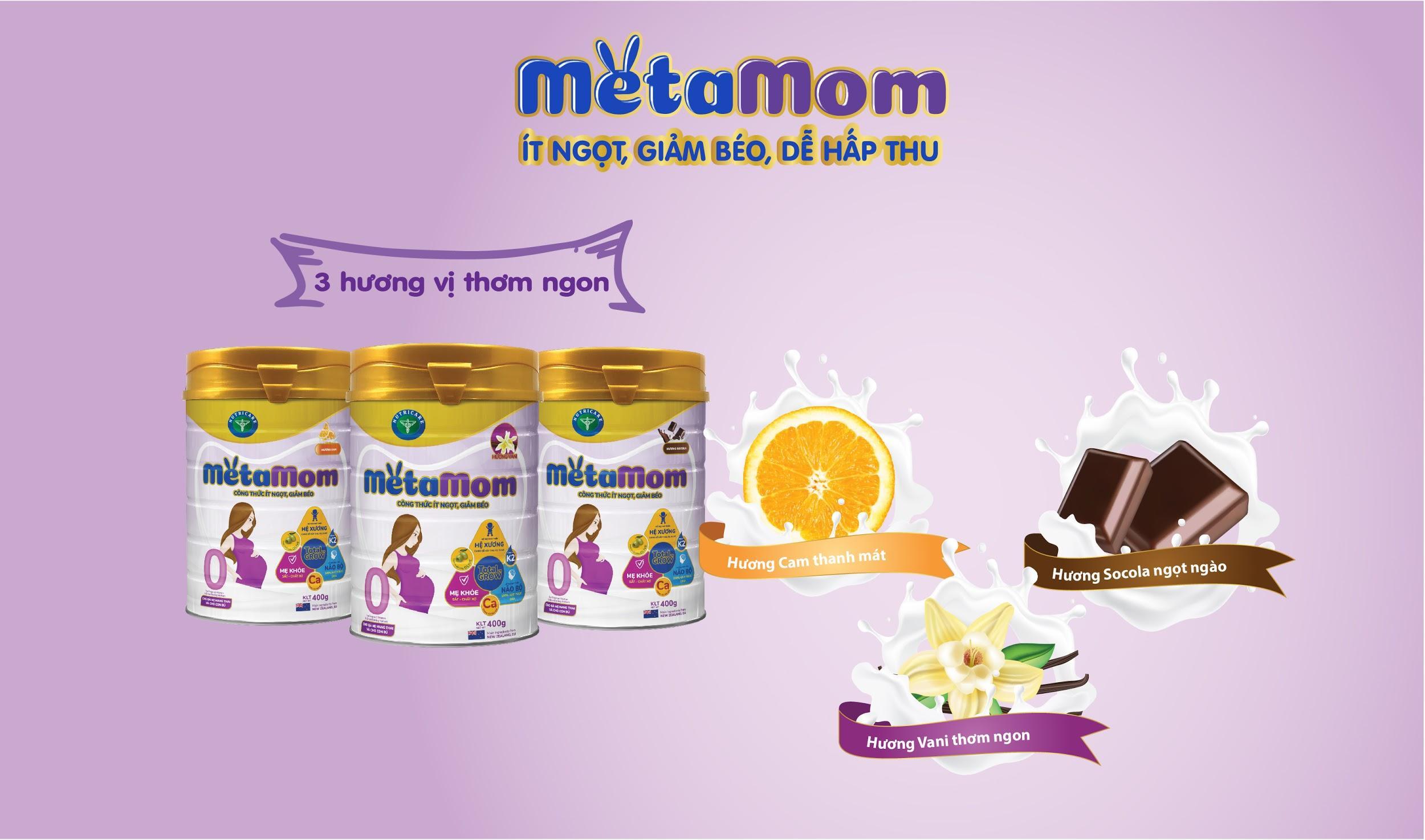Đặc biệt Metamom có thêm định lượng hộp 10 gói 3 hương: Cam, vani, socola thơm ngon mẹ có thêm lựa chọn và tiện lợi hơn khi mang đi xa.