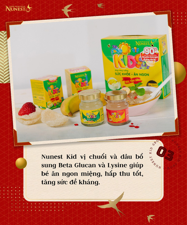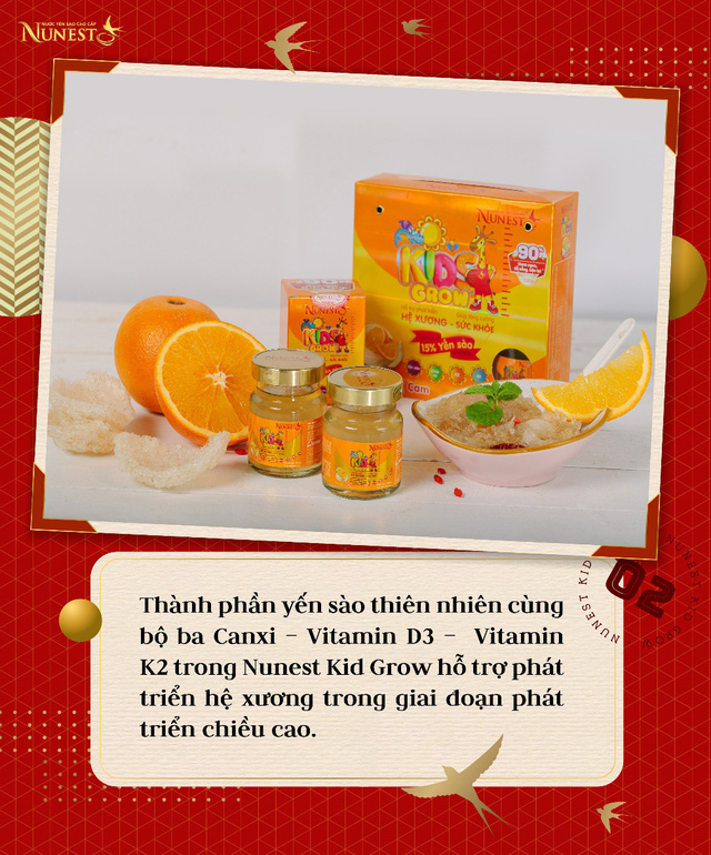 Hiểu được mong muốn của ba mẹ, các chuyên gia dinh dưỡng và y học hàng đầu của Nunest đã nghiên cứu bổ sung và cho ra đời Nunest Kid Grow – sản phẩm nước yến tiên phong kết hợp giữa tổ yến thiên nhiên và 3 dưỡng chất vàng gồm Canxi, vitamin D3, vitamin K2. Nunest Kid Grow giúp trẻ tăng cường sức khỏe và hỗ trợ phát triển hệ xương trong giai đoạn phát triển chiều cao.