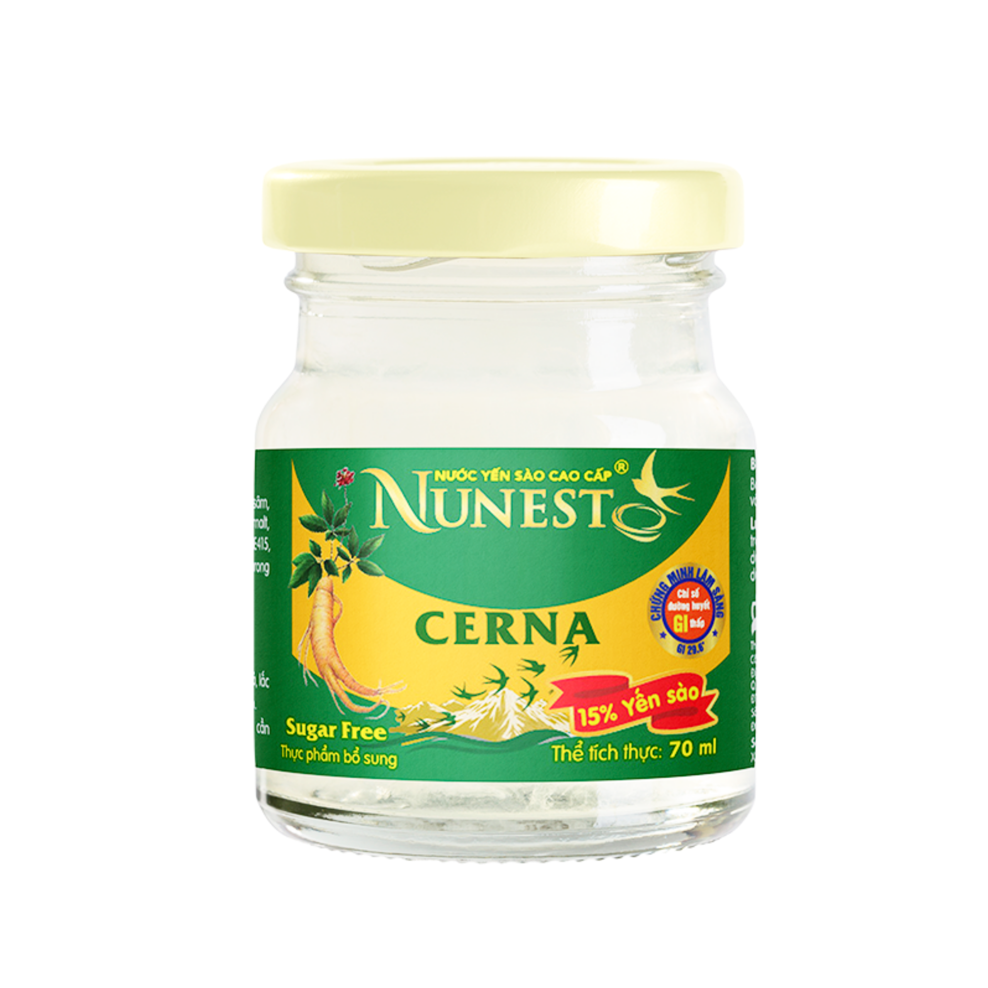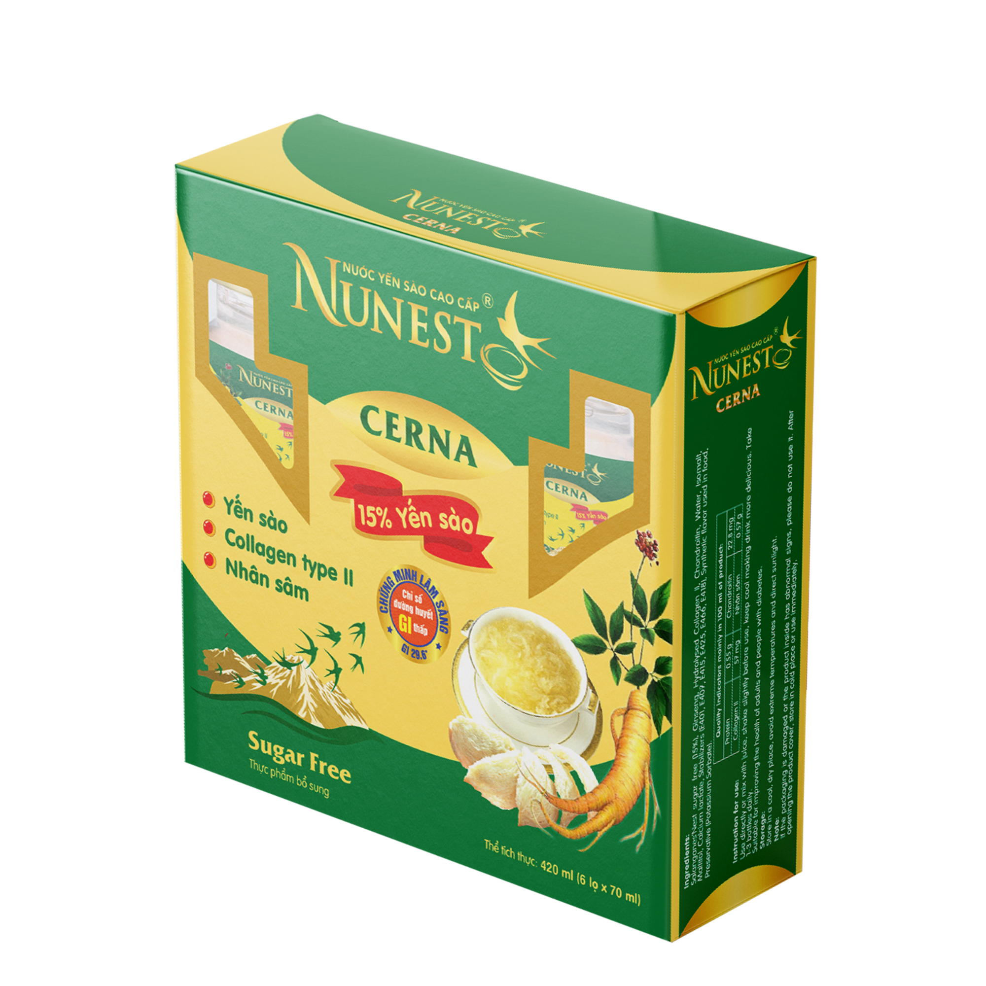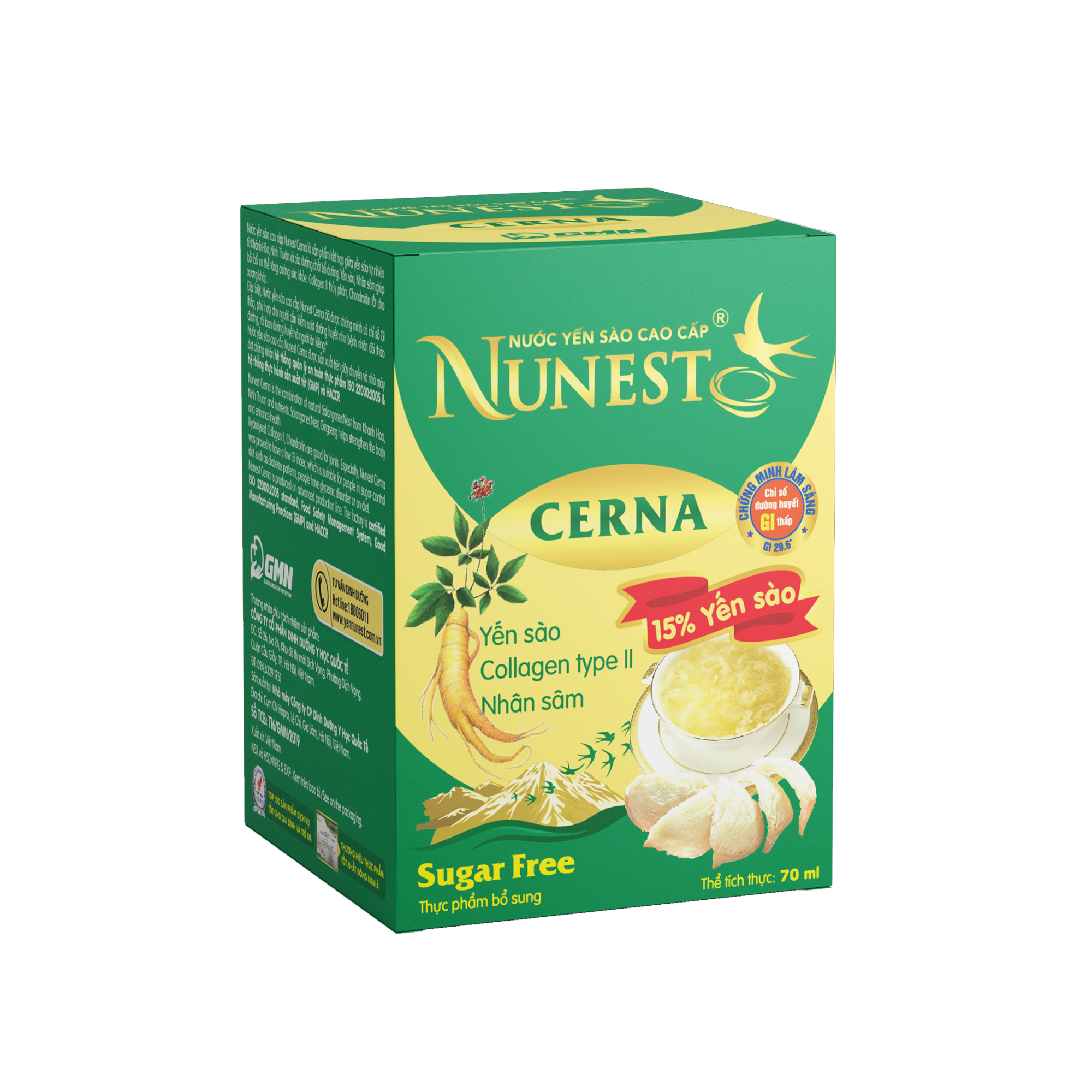Nước yến sào cao cấp Nunest Cerna là sản phẩm kết hợp giữa yến sào tư nhiên từ Khánh Hoà và Ninh Thuận với các dưỡng chất bổ dưỡng. Yến sào, nhân sâm bổ dưỡng cho sức khoẻ. Collagen type II, Chondroitin tốt cho xương khớp. Đặc biệt, nước yến sào cao cấp Nunest Cerna đã được chứng minh có chỉ số GI thấp, phù hợp cho người cần kiểm soát đường huyết như bệnh nhân đái tháo đường, rối loạn đường huyết và người ăn kiêng*.