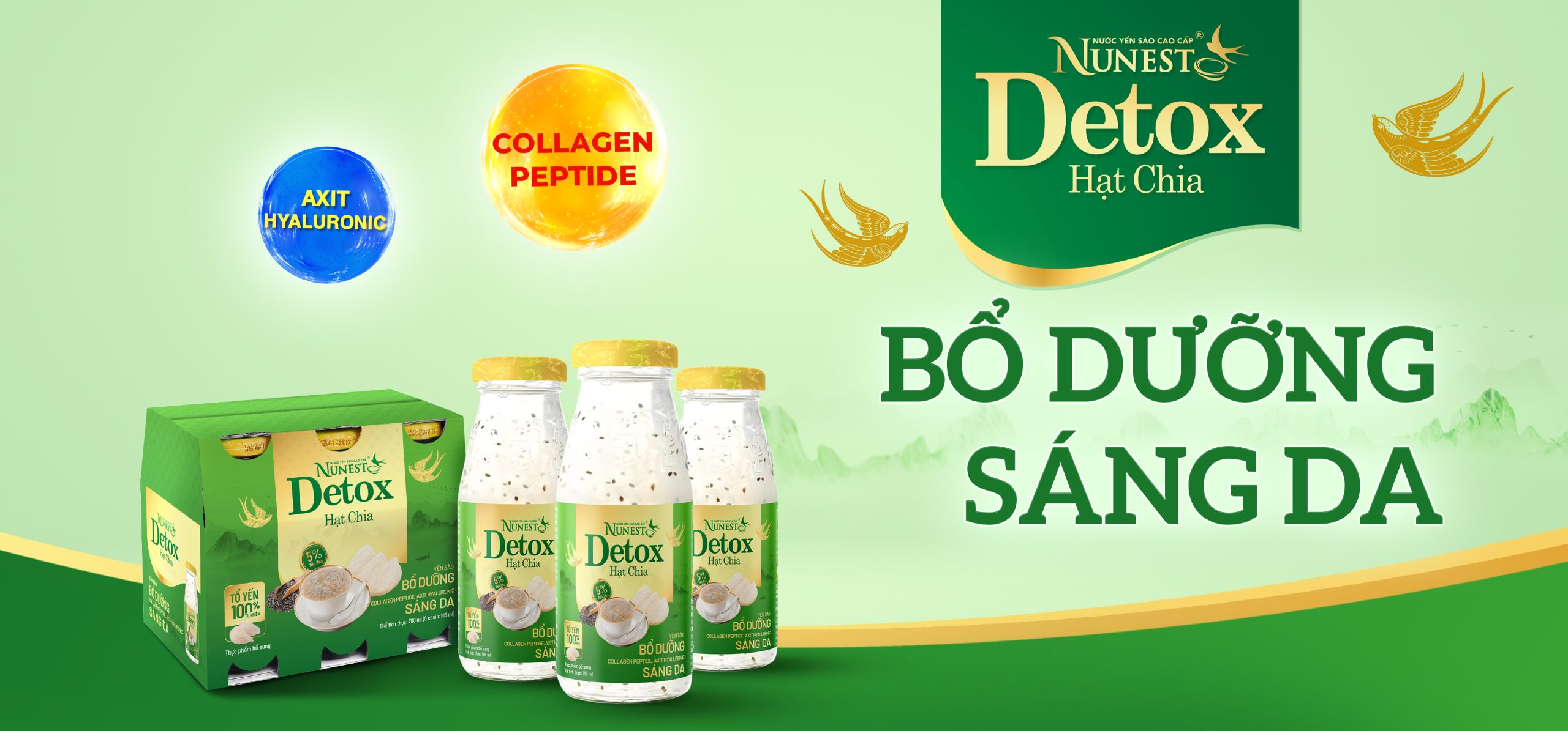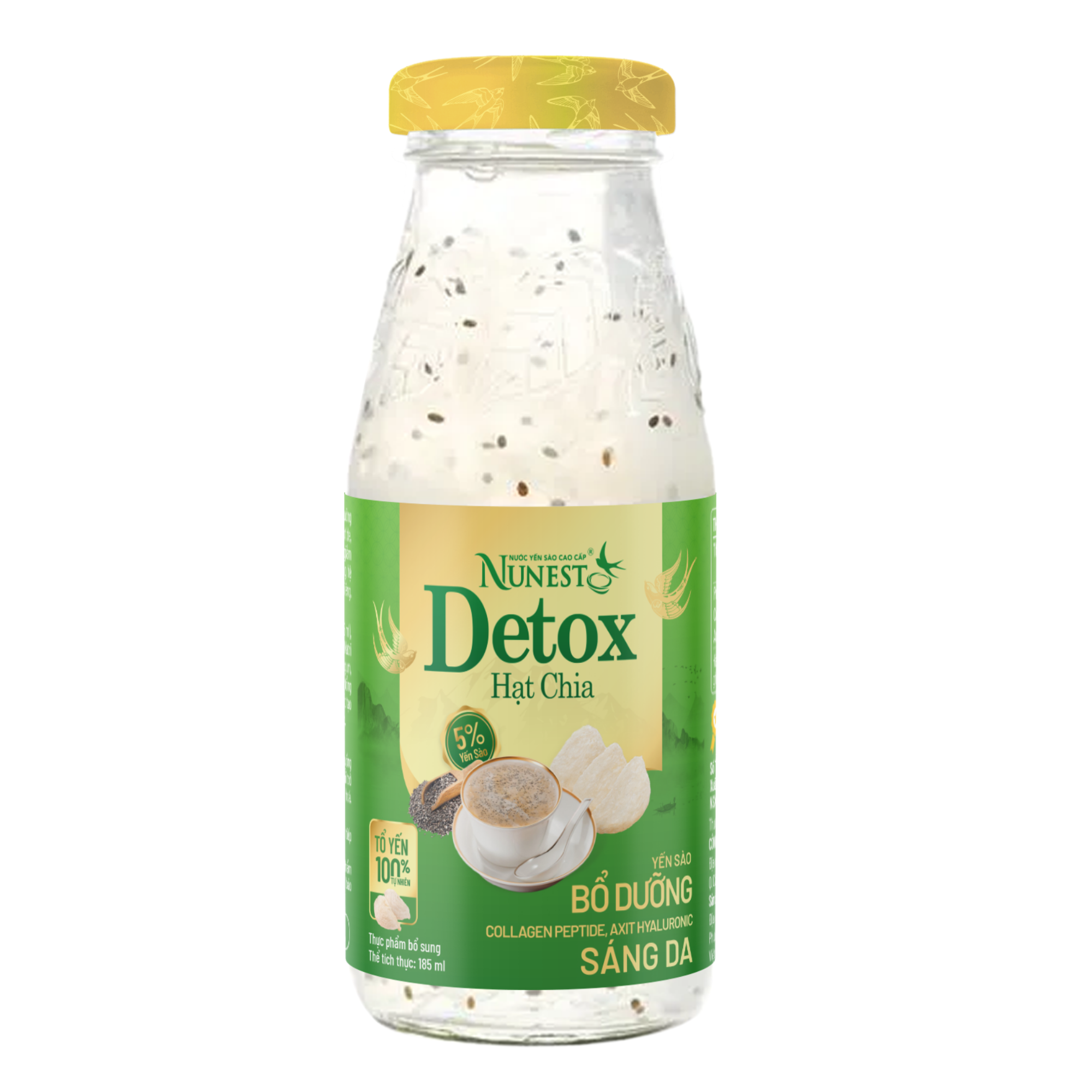 Nước yến sào cao cấp Nunest Detox Hạt chia bổ dưỡng cho sức khoẻ với tổ yến 100% tự nhiên. Collagen peptide, Axit Hyaluronic tăng độ ẩm giúp da đàn hồi săn chắc, giảm hiện tượng da khô, duy trì làn da trẻ trung. Sử dụng hệ đường ăn kiêng, dùng được cho người tiểu đường, ăn kiêng.