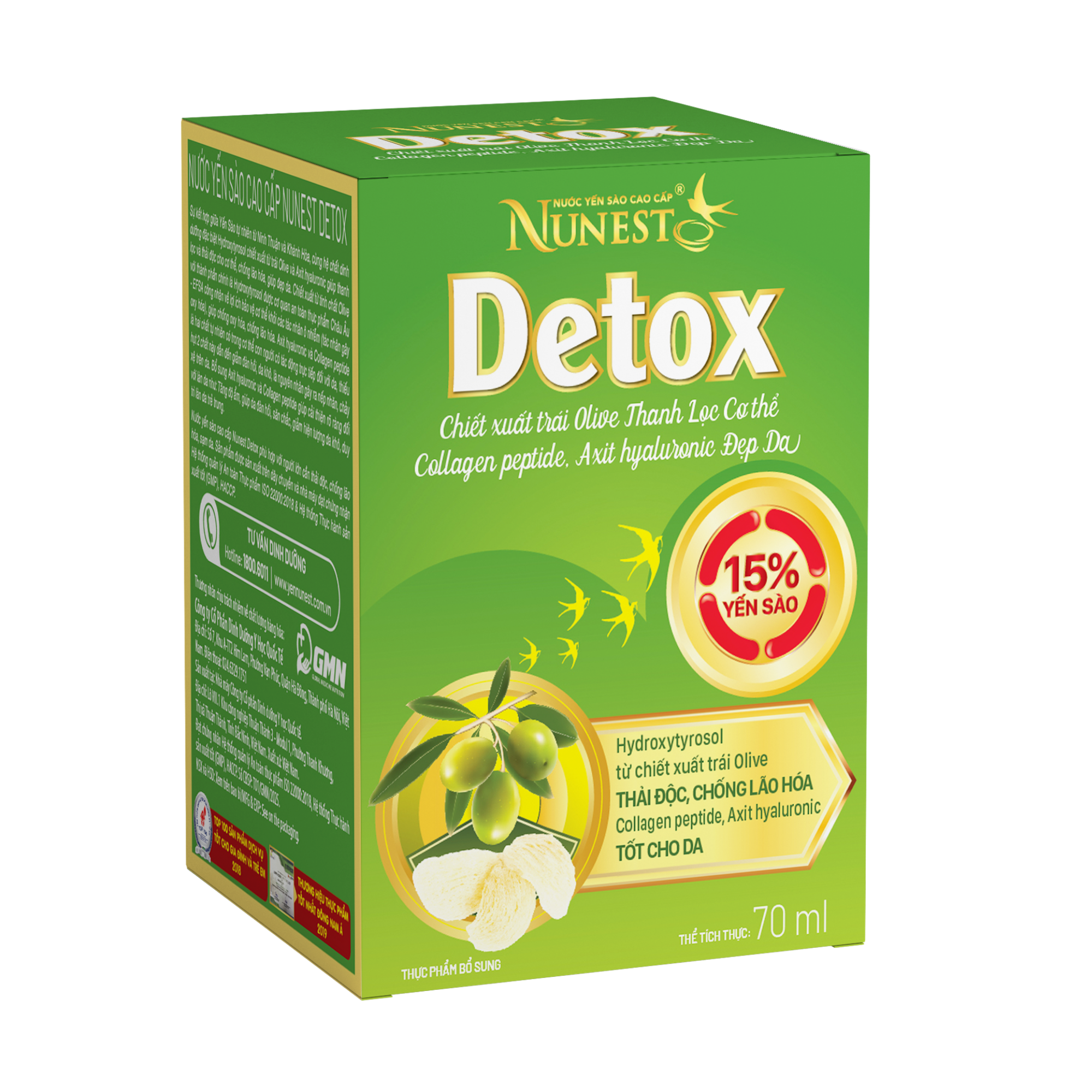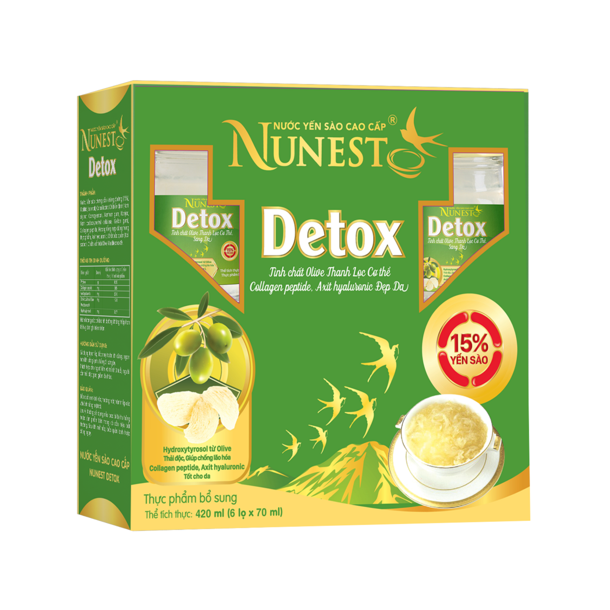 Sự kết hợp giữa yến sào tự nhiên từ Ninh Thuật và Khánh Hoà, cùng hệ chất dinh dưỡng đặc biệt hydroxytyrosol chiết xuất từ trái olive và axit hyaluronic giúp thanh lọc và giải độc cơ thể, chống lão hoá giúp đẹp da.
