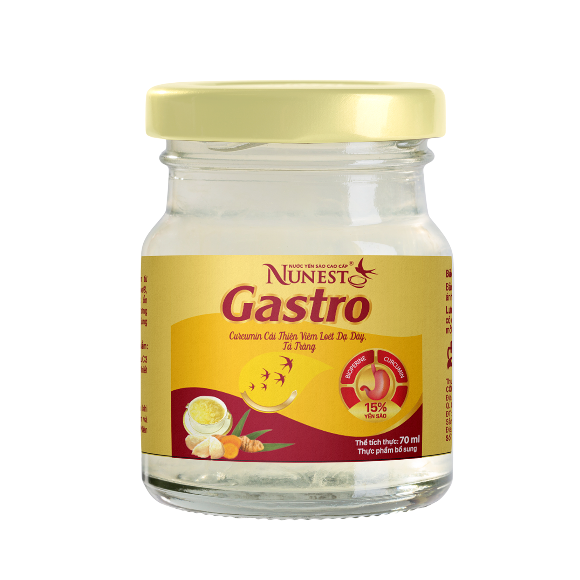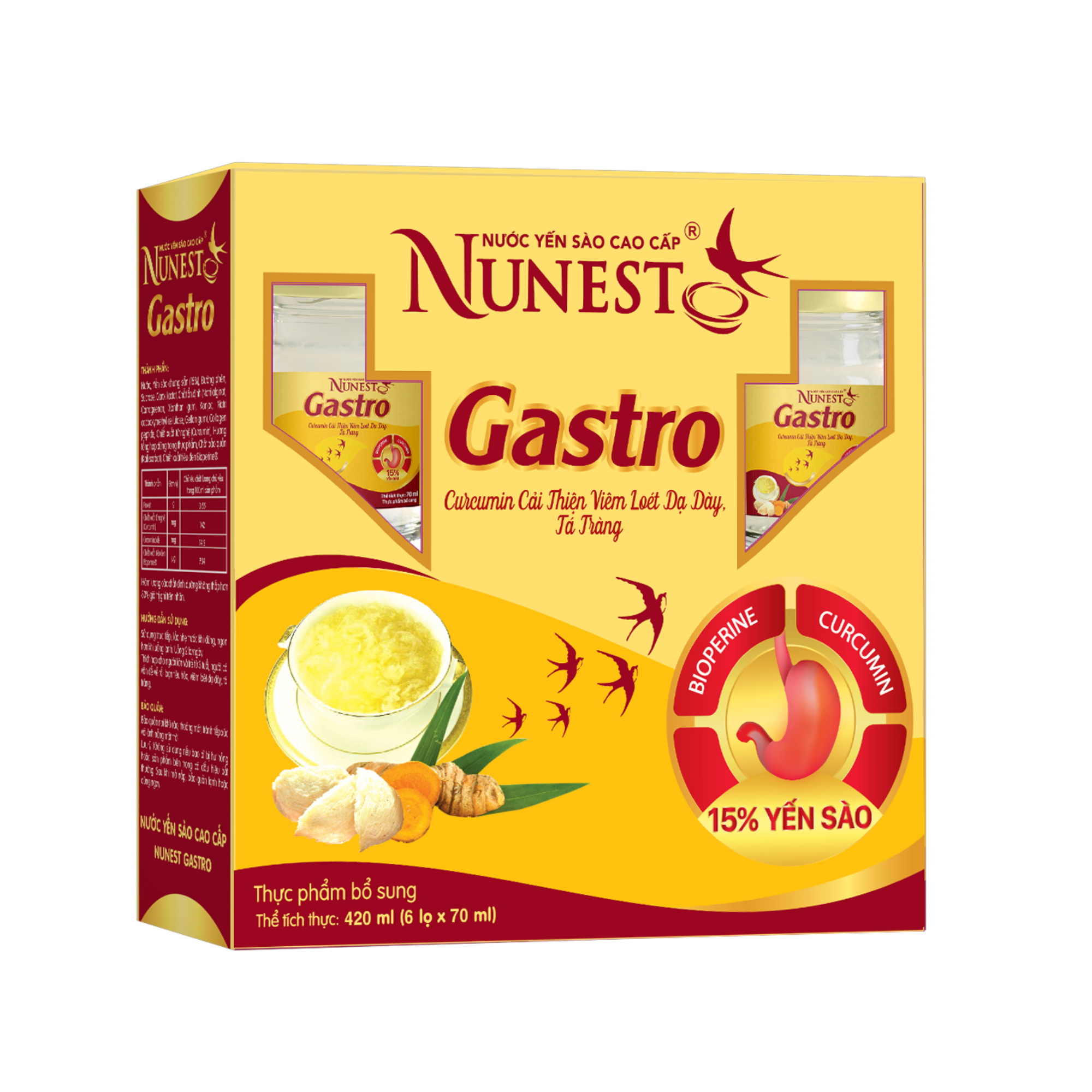 Nước yến sào cao cấp Nunest Gastro bổ dưỡng cho sức khoẻ, với tổ yến 100% từ vùng biển Ninh Thuận, Khánh Hoà. Chiết xuất nghệ chứa Curcumin hỗ trợ giảm viêm loét dạ dày, tá tràng, Cải thiện hội chứng ruột kích thích, và giảm chứng khó tiêu. Cùng chiết xuất tiêu đen Bioperine chứa Piperin giúp tăng sinh khả dụng của Curcumin.