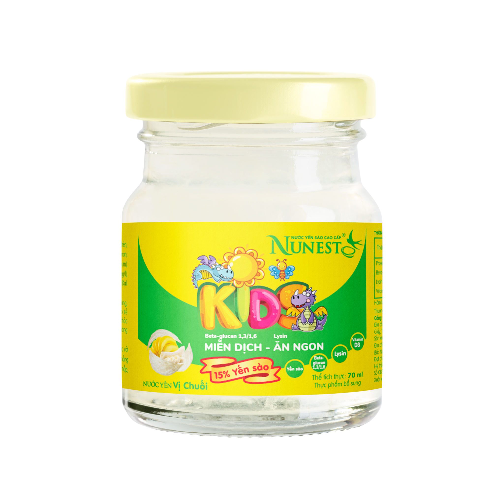 Nước yến sào cao cấp Nunest Kid vị Chuối là sản phẩm kết hợp giữa yến sào tự nhiên từ Khánh Hoà, Ninh Thuận cùng bột Chuối tự nhiên và các dưỡng chất bổ dưỡng. Yến sào bổ dưỡng cho sức khoẻ. Lysin giúp bé ăn ngon miệng cùng vitamin D3 hỗ trợ phát triển chiều cao. Đặc biệt, tăng cường sức đề kháng với Beta-glucan 1,3/1,6.