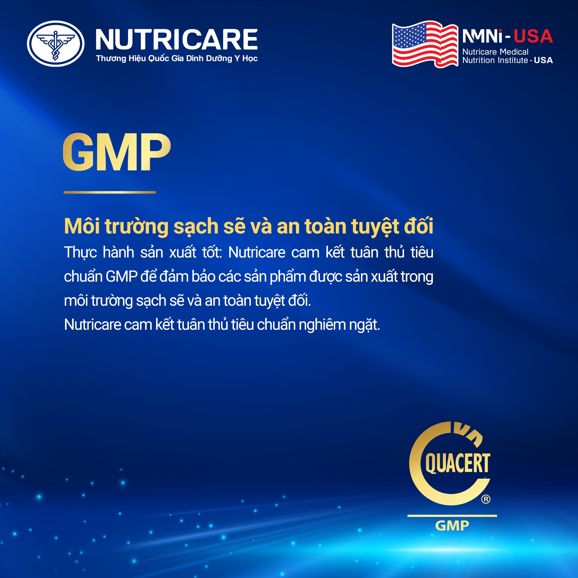 Nutricare thực hành sản xuất tốt theo tiêu chuẩn GMP, vận hành trong môi trường sạch sẽ, an toàn tuyệt đối, kiểm soát chặt chẽ điều kiện sản xuất, bảo đảm sự đồng nhất về chất lượng của từng sản phẩm dinh dưỡng.