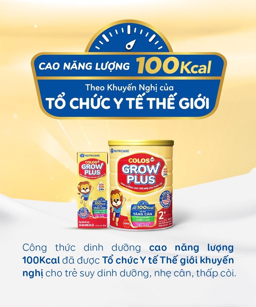 Cụ thể, Nutricare Colos24h Grow Plus 2+ mới chứa công thức Cao Năng Lượng 100Kcal/100ml, đặc chế cho trẻ suy dinh dưỡng thấp còi theo khuyến nghị của Tổ chức Y tế Thế giới (WHO), kết hợp cùng protein chất lượng cao giúp bé tăng cân khỏe mạnh.