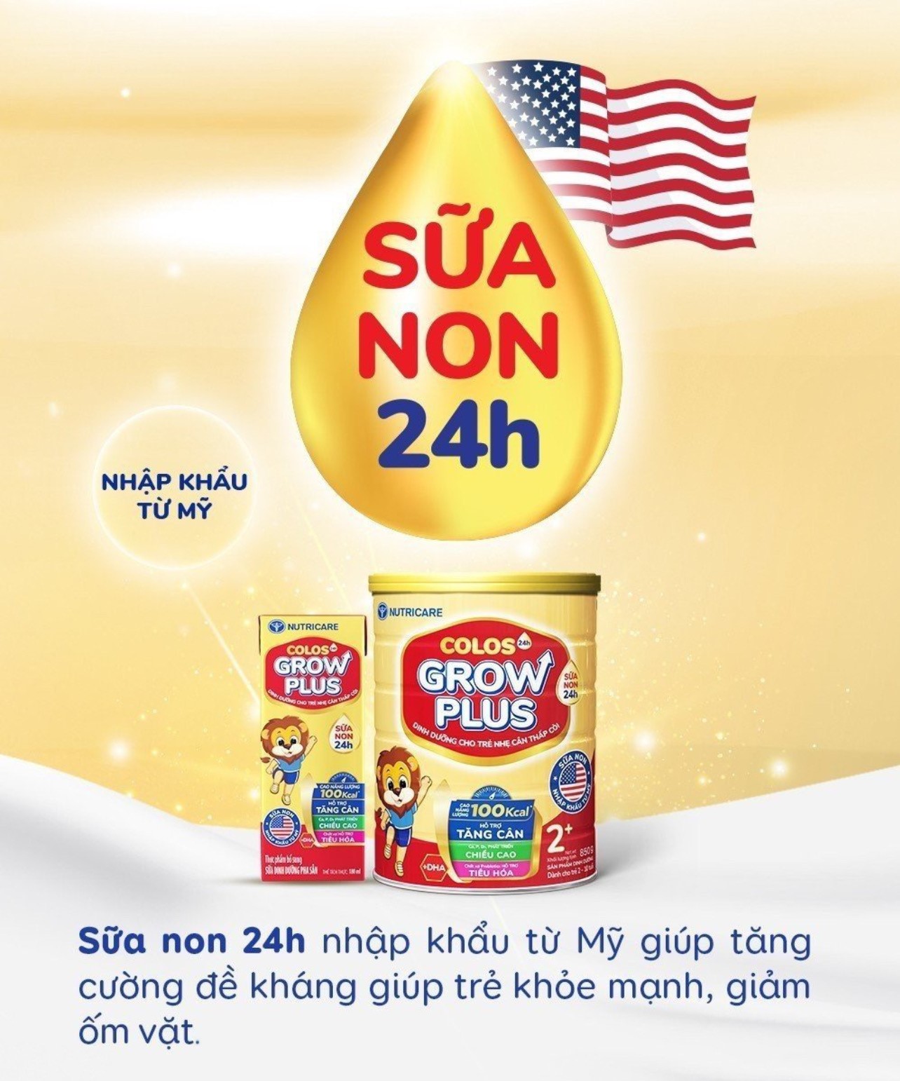 Thấu hiểu nỗi lo của mẹ bỉm trên hành trình giúp con tăng cân cao khỏe, tăng cường hệ miễn dịch, các chuyên gia dinh dưỡng Nutricare đã nghiên cứu và cho ra đời Nutricare Colos24h Grow Plus 2+ mới. Sản phẩm là sự kết hợp đặc biệt giữa công thức dinh dưỡng Cao Năng Lượng 100Kcal và Sữa non 24h, hóa giải nỗi lo lắng của mẹ bỉm về vấn đề suy dinh dưỡng thấp còi, nhẹ cân, ốm vặt liên miên của trẻ.