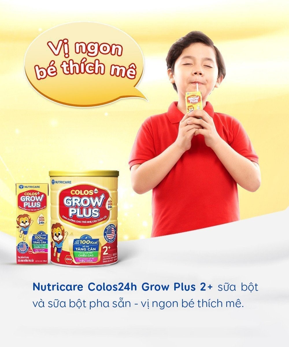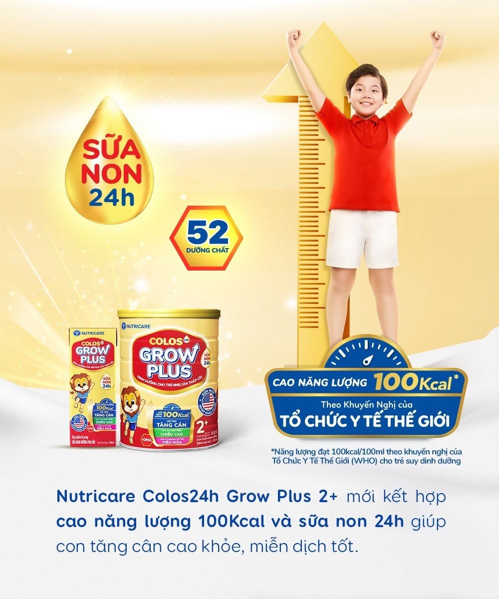 Nutricare Colos24h Grow Plus 2+ mới với công thức Cao Năng Lượng 100Kcal cùng Sữa non 24h giúp trẻ tăng cân cao khoẻ