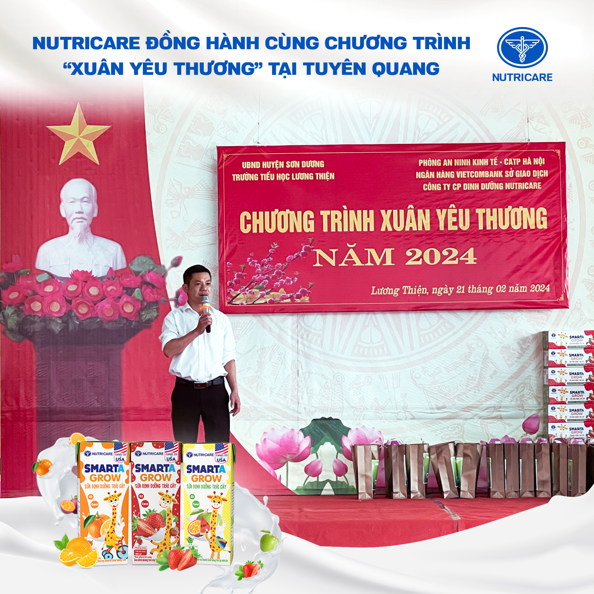 Sáng ngày 21/02/2024, Công ty Cổ phần Dinh dưỡng Nutricare đồng hành cùng chương trình “Xuân yêu thương” do Phòng An ninh kinh tế (PA 04), Công an TP.Hà Nội tổ chức tại Trường tiểu học Lương Thiện, thôn Đồng Quang, xã Lương Thiện, huyện Sơn Dương, tỉnh Tuyên Quang.