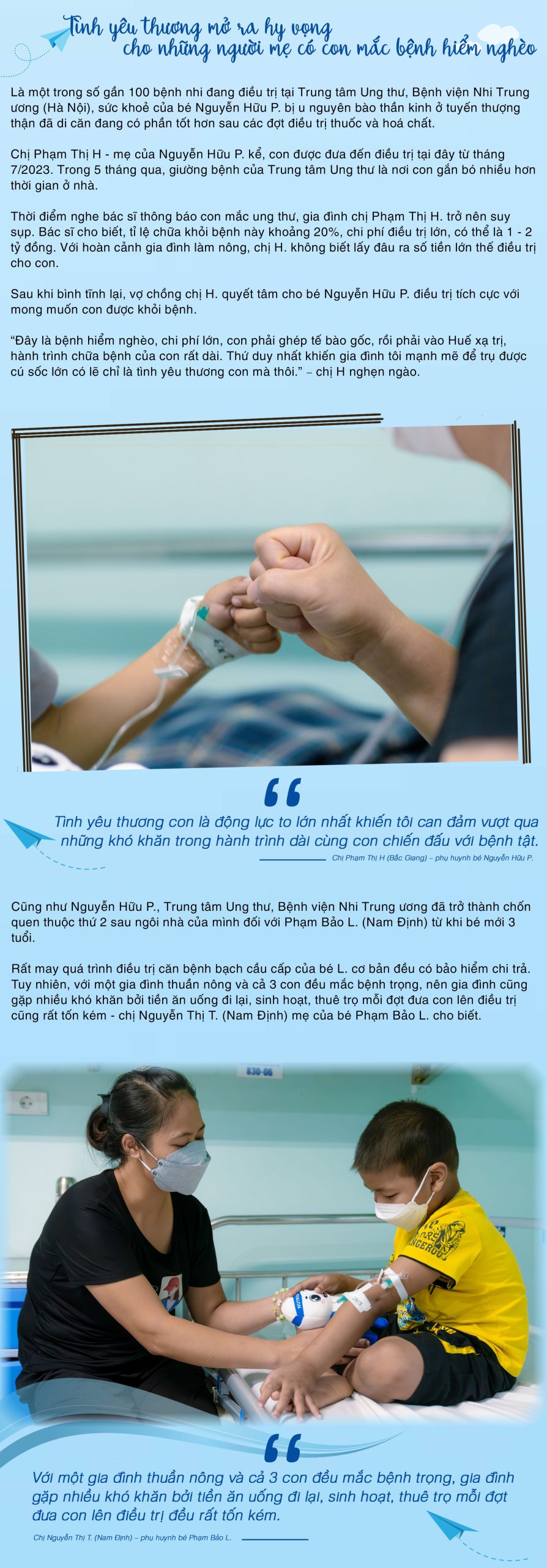 Đó là câu nói mà chị Phạm Thị H (Bắc Giang) được nghe nhiều nhất trong suốt 5 tháng nay khi cùng con trai là bé Nguyễn Hữu P (4 tuổi) điều trị tại Khoa Ung bướu, Bệnh viện Nhi Trung ương (Hà Nội).