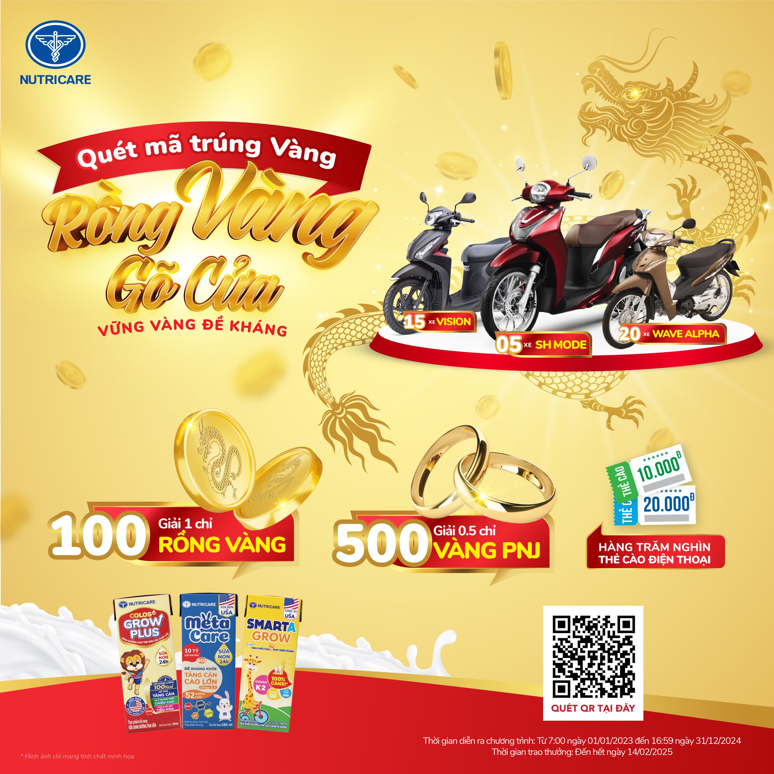 Rinh tài lộc – đón năm rồng vàng cùng chương trình khuyến mại siêu hấp dẫn của Nutricare! Khi mua sữa Smarta Grow, Metacare, Nutricare Colos24h Grow Plus pha sẵn tiện lợi, khách hàng sẽ trúng ngay 100% các giải thưởng có giá trị.