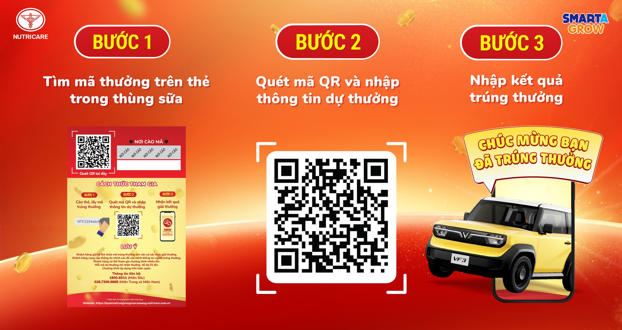 - Quét mã QR code được in trên thẻ cào hoặc truy cập vào website https://quetmatrungvangvungvangdekhang.nutricare.com.vn để nhập mã dự thưởng và các thông tin theo yêu cầu.