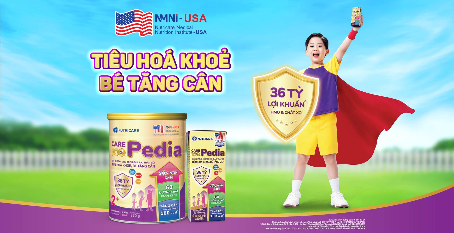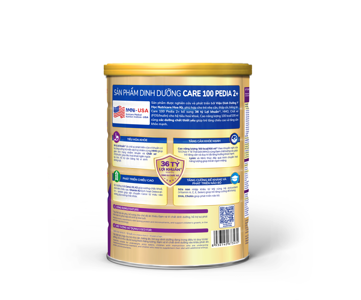 Sản phẩm được nghiên cứu và phát triển bởi Viện Dinh Dưỡng Y Học Nutricare Hoa Kỳ, phù hợp cho trẻ nhẹ cân, thấp còi, biếng ăn. Care 100 Pedia 2+ bổ sung 36 tỷ Lợi khuẩn(*), HMO, Chất xơ (FOS/Inulin) cho hệ tiêu hoá khoẻ, Cao năng lượng 100 kcal/100 ml cùng các dưỡng chất thiết yếu giúp trẻ tăng chiều cao và tăng cân khoẻ mạnh.