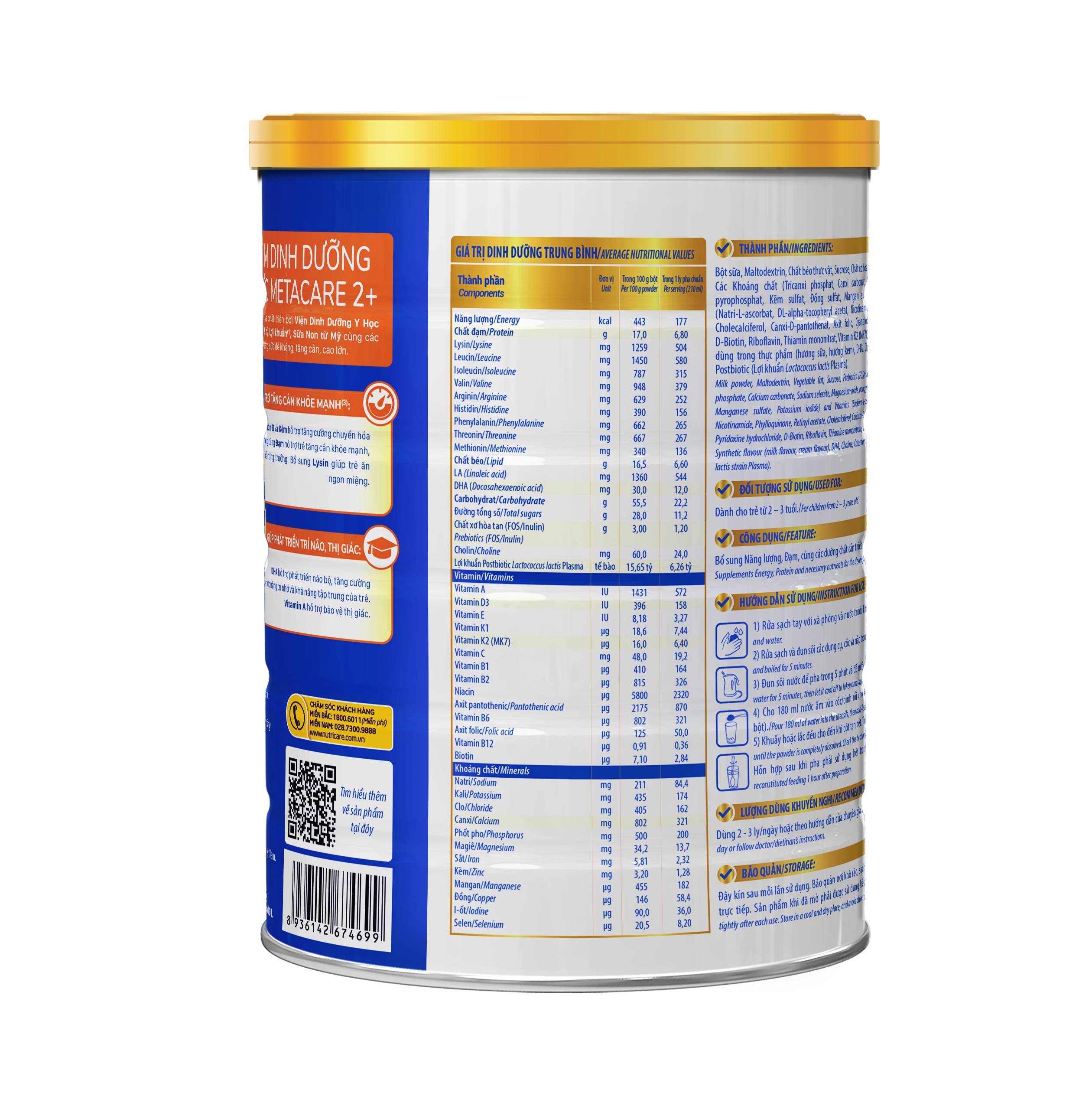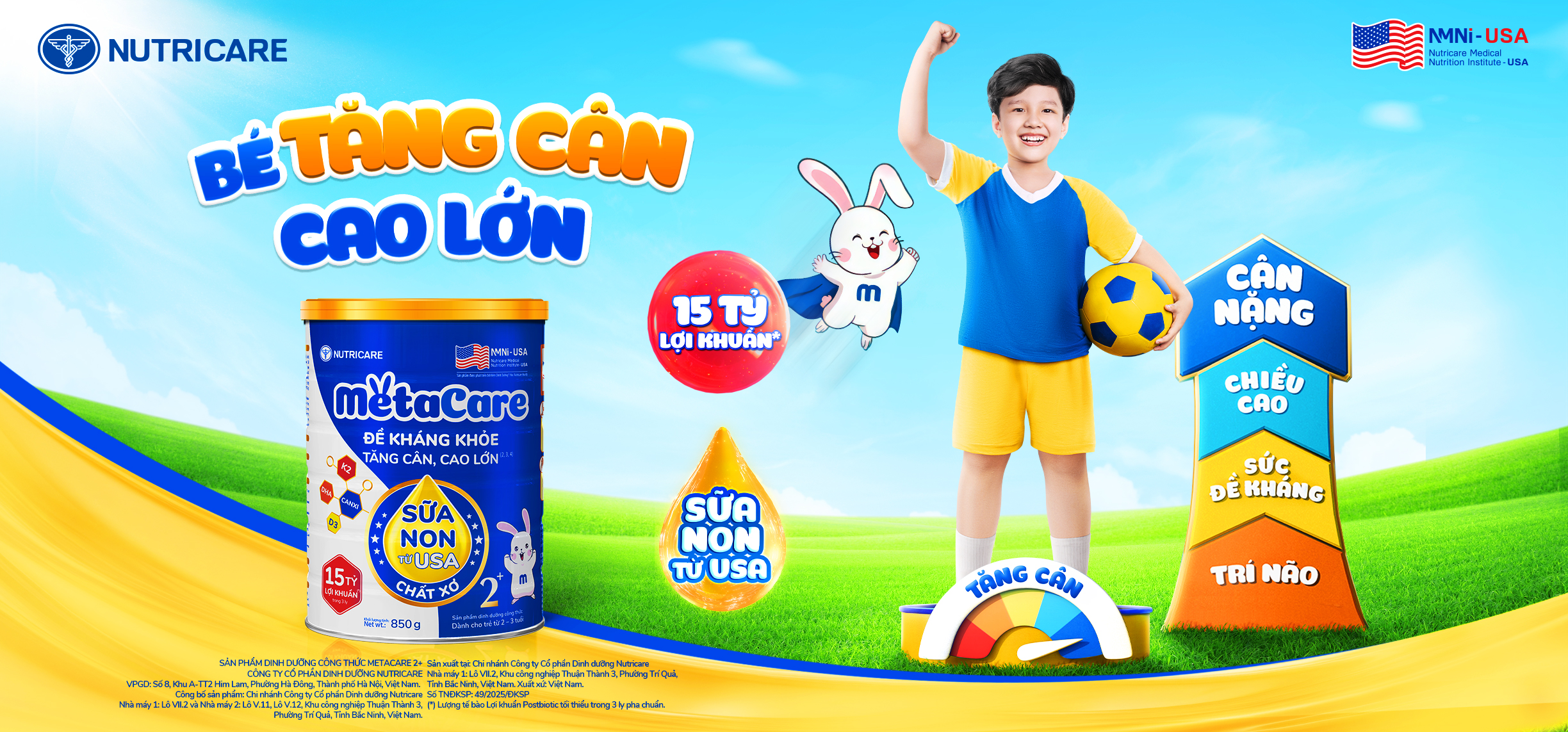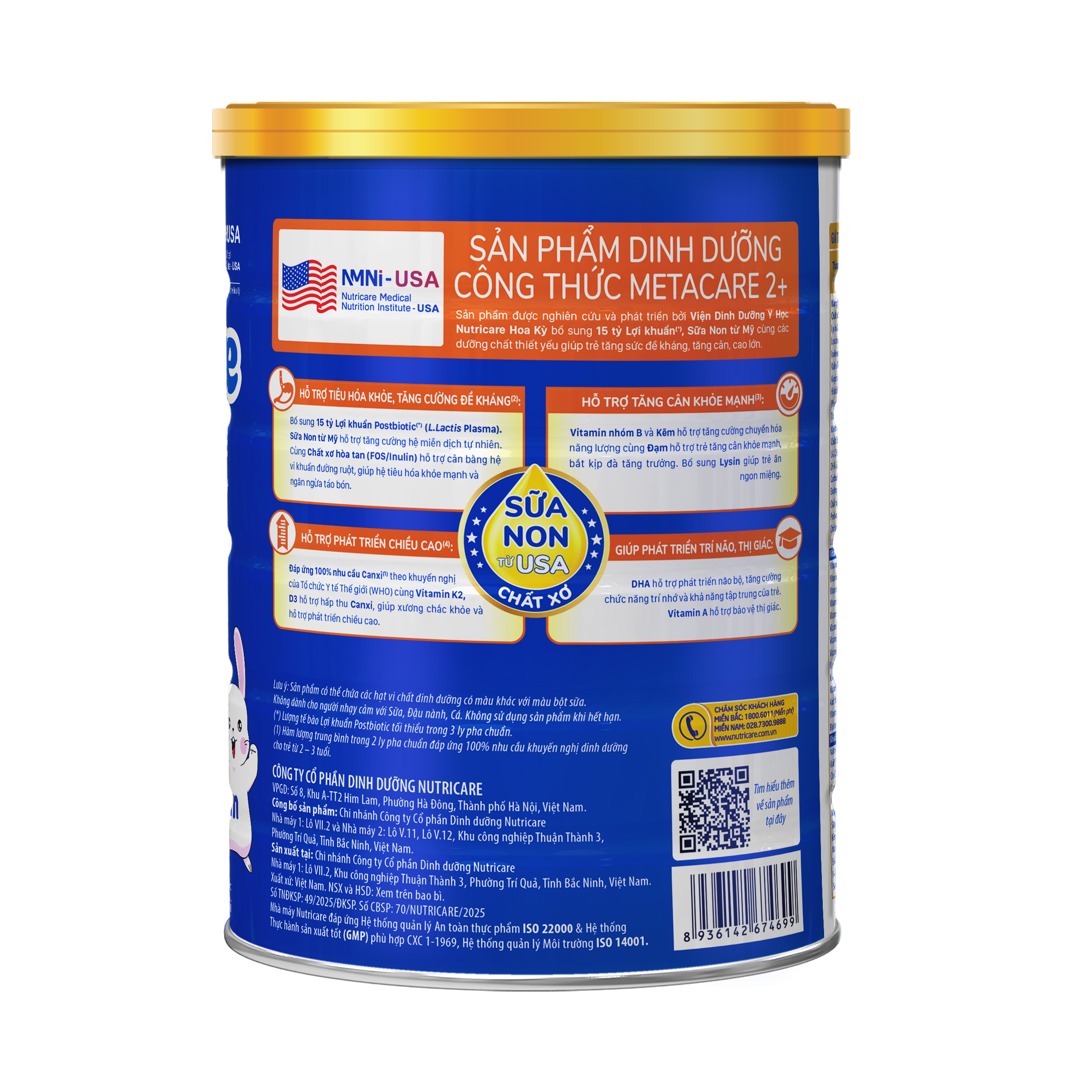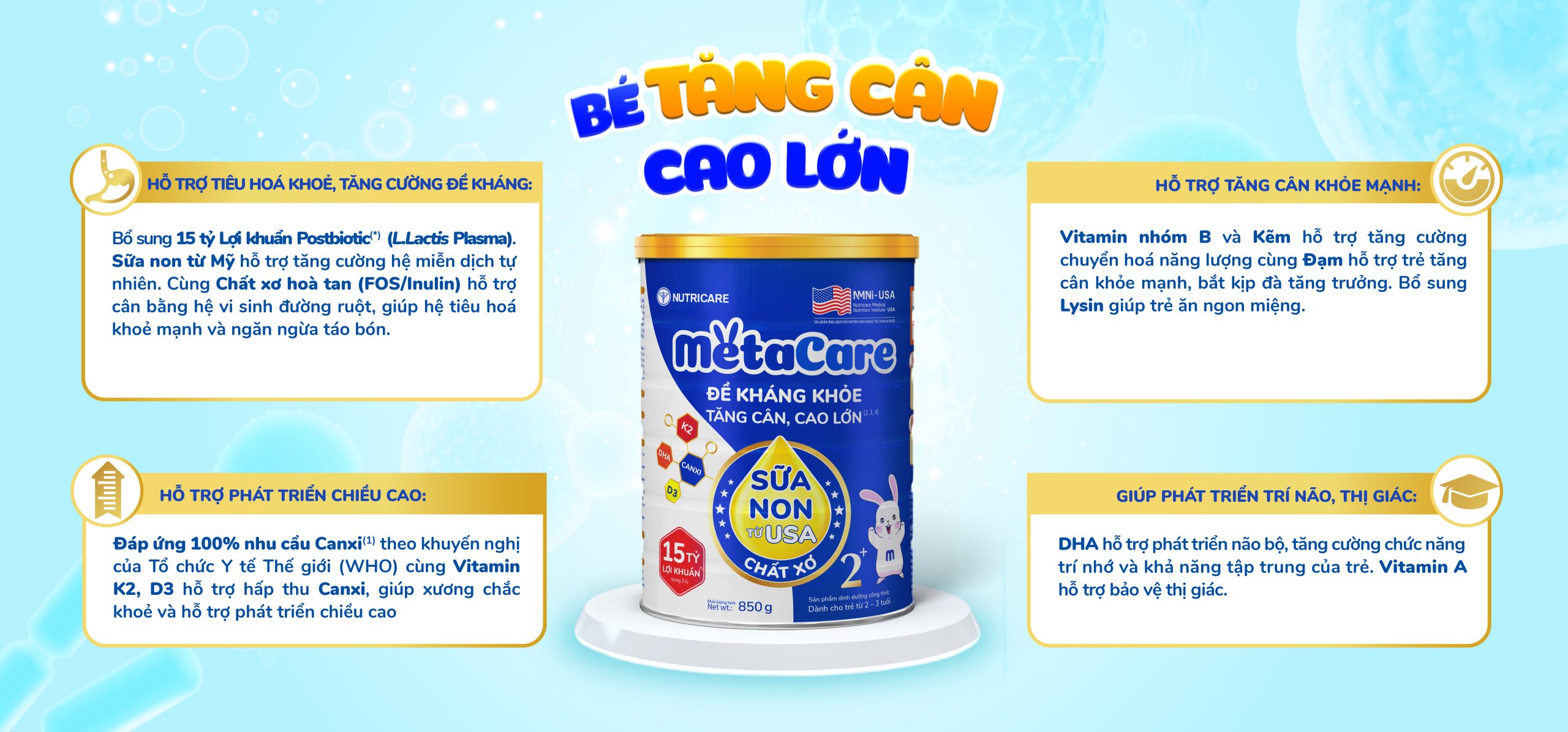 Sản phẩm được nghiên cứu và phát triển bởi Viện Dinh Dưỡng Y Học Nutricare Hoa Kỳ bổ sung 15 tỷ Lợi khuẩn(*), Sữa Non từ Mỹ cùng các dưỡng chất thiết yếu giúp trẻ tăng sức đề kháng, tăng cân, cao lớn.