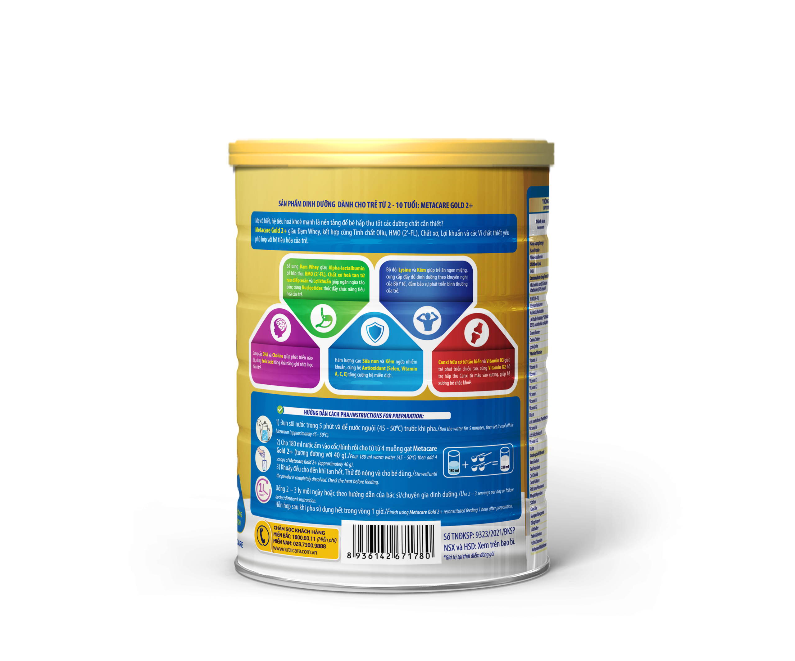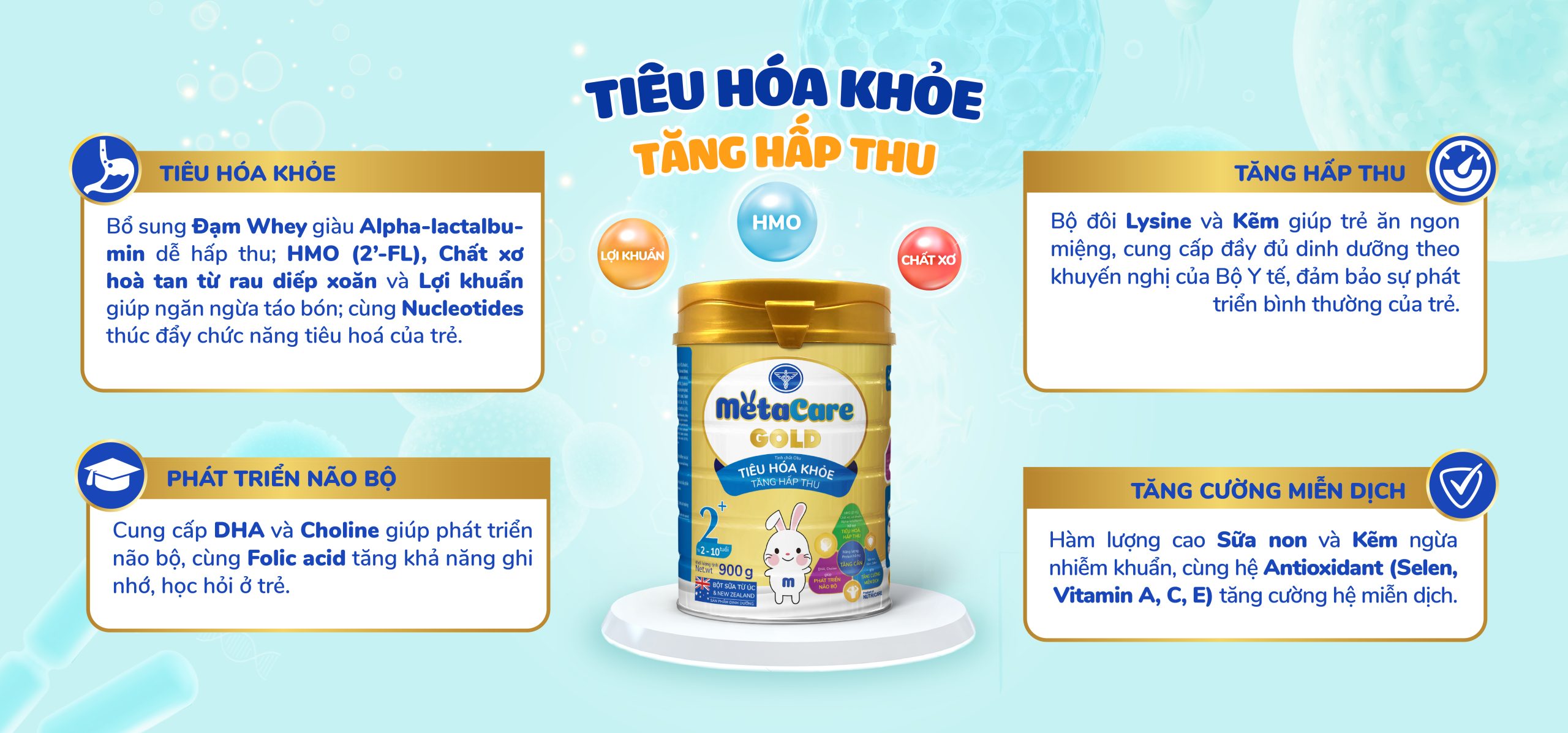 Đạm Whey dễ hấp thu kết hợp HMO, Chất xơ hòa tan, Lợi khuẩn và Nucleotide giúp cân bằng hệ vi sinh, ngăn ngừa táo bón và tăng khả năng hấp thu dưỡng chất cho bé.