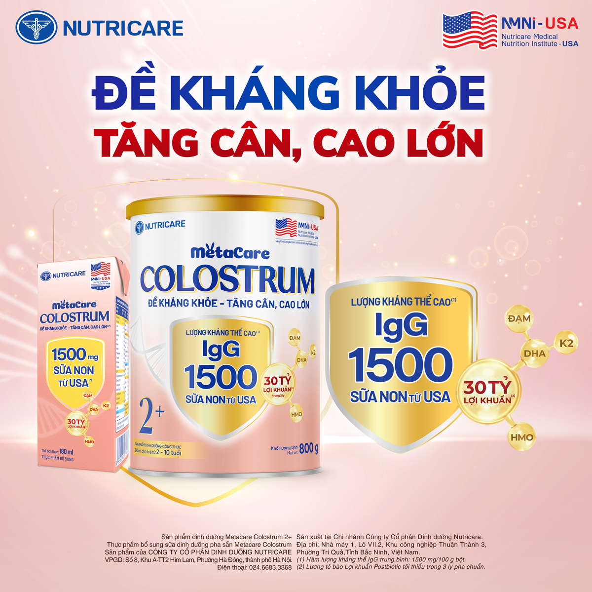 Sản phẩm được nghiên cứu và phát triển bởi Viện Dinh Dưỡng Y Học Nutricare Hoa Kỳ bổ sung Sữa Non giàu kháng thể IgG với 1500 mg(1) cùng 30 tỷ Lợi khuẩn Postbiotic(2) và các dưỡng chất cần thiết giúp đề kháng khỏe, bé tăng cân, cao lớn.