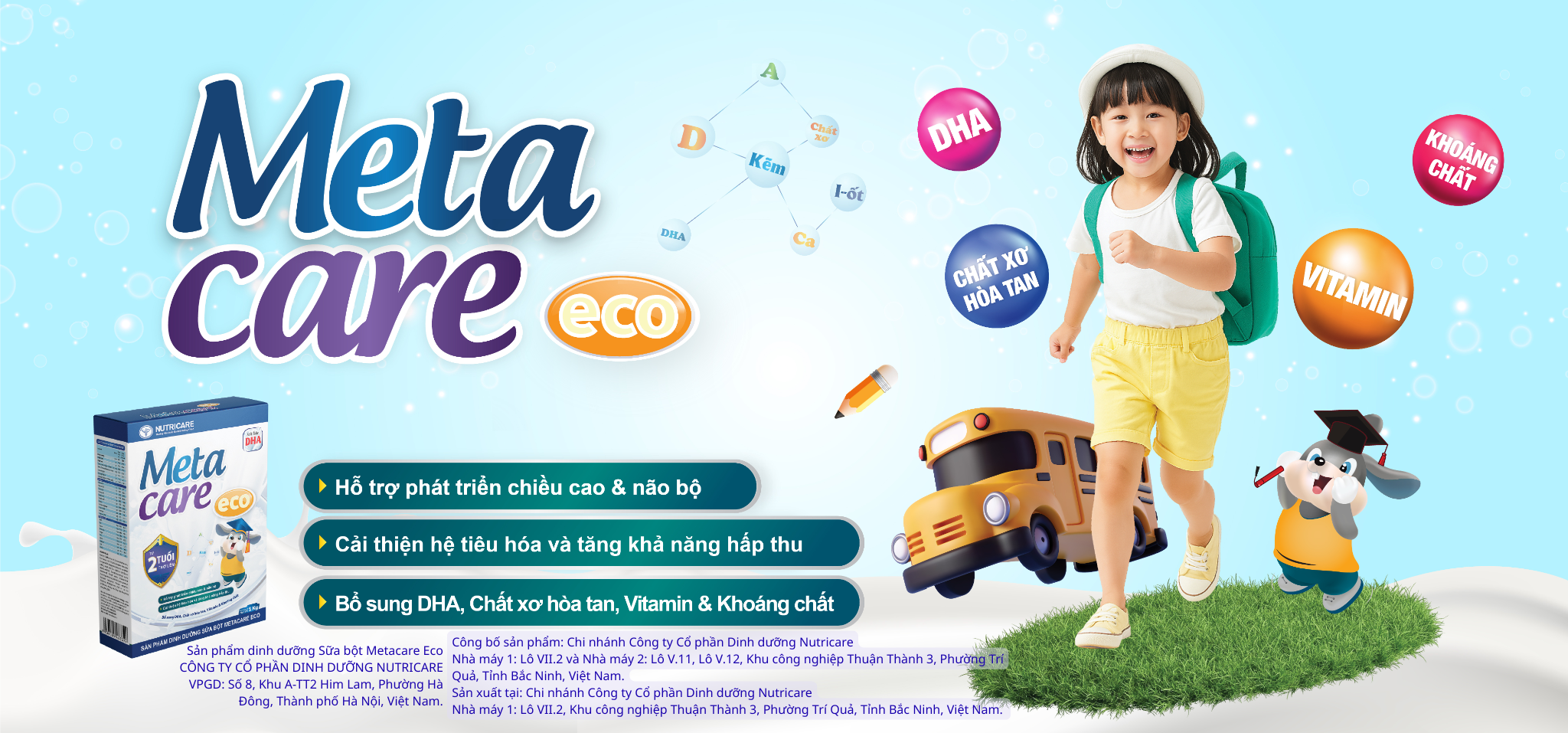 Metacare Eco – Sản phẩm dinh dưỡng dành cho trẻ từ 2 tuổi trở lên, công thức giàu dinh dưỡng và Protein giúp trẻ tăng cân, bổ sung thêm DHA, Chất xơ hòa tan (FOS/Inulin) cùng các nhóm vi chất thiết yếu giúp trẻ phát triển cân đối chiều cao, trí não, miễn dịch và tiêu hóa tốt.
