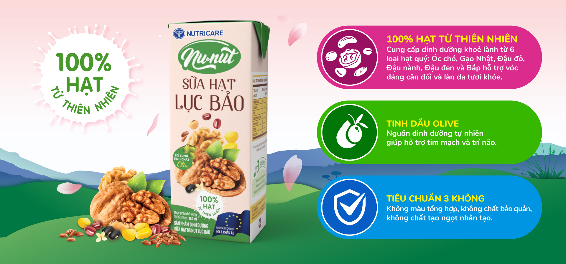 Cung cấp dinh dưỡng khoẻ lành từ 6 loại hạt quý: Óc chó, Gạo Nhật, Đậu đỏ, Đậu nành, Đậu đen và Bắp – mỗi loại hạt đều giàu dưỡng chất, góp phần hỗ trợ vóc dáng cân đối và làn da tươi khỏe.