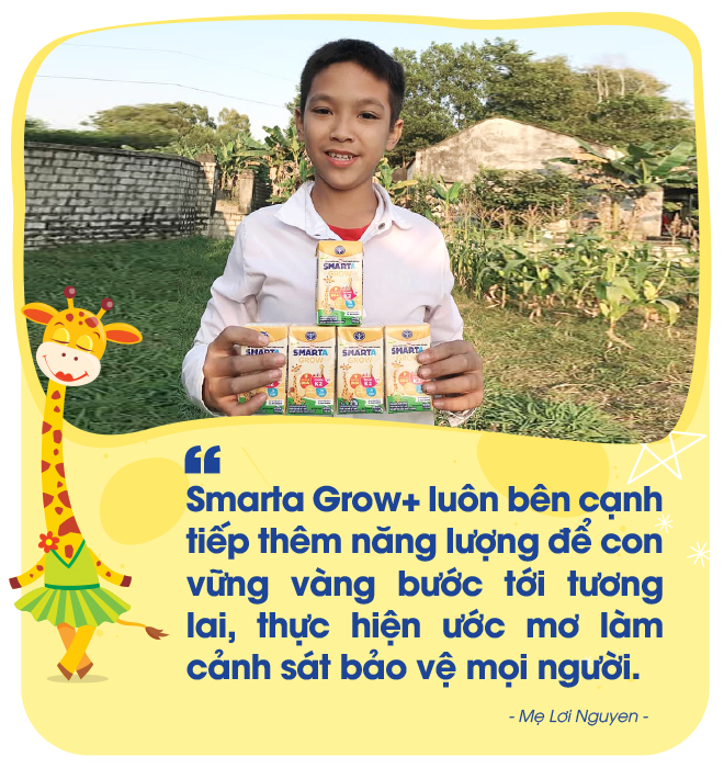 Để ước mơ làm cảnh sát trở thành hiện thực, mẹ Lơi Nguyên cho biết, con không chỉ nỗ lực học tập, hoàn thành các bài tập cô giáo giao mà còn chăm chỉ uống sữa Smarta Grow+ để bổ sung năng lượng và phát triển trí não. Được biết, Smarta Grow+ bổ sung DHA, Axit Folic, Choline hỗ trợ tăng cường trí não, cải thiện khả năng ghi nhớ và học hỏi, giảm nguy cơ phát triển chậm ngôn ngữ, duy trì và bảo vệ thị giác của trẻ. Do vậy, mỗi ngày mẹ Lơi Nguyên luôn bổ sung cho con 2 hộp sữa Smarta Grow+ để tiếp thêm năng lượng, cùng con hiện thực hóa ước mơ.