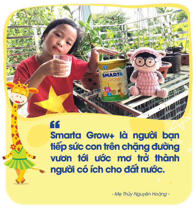 Bên cạnh việc hỗ trợ con trong học tập và rèn luyện, mẹ Thủy Nguyên Hòang không quên nạp thêm cho con các dưỡng chất thiết yếu bằng việc bổ sung sữa Smarta Grow+ mỗi ngày để con phát triển toàn diện. Sữa Smarta Grow+ bổ sung bộ ba Canxi Nano, Vitamin D3, Vitamin K2 chính là bí quyết của mẹ Thủy Nguyên Hoàng để con phát triển chiều cao tối ưu.